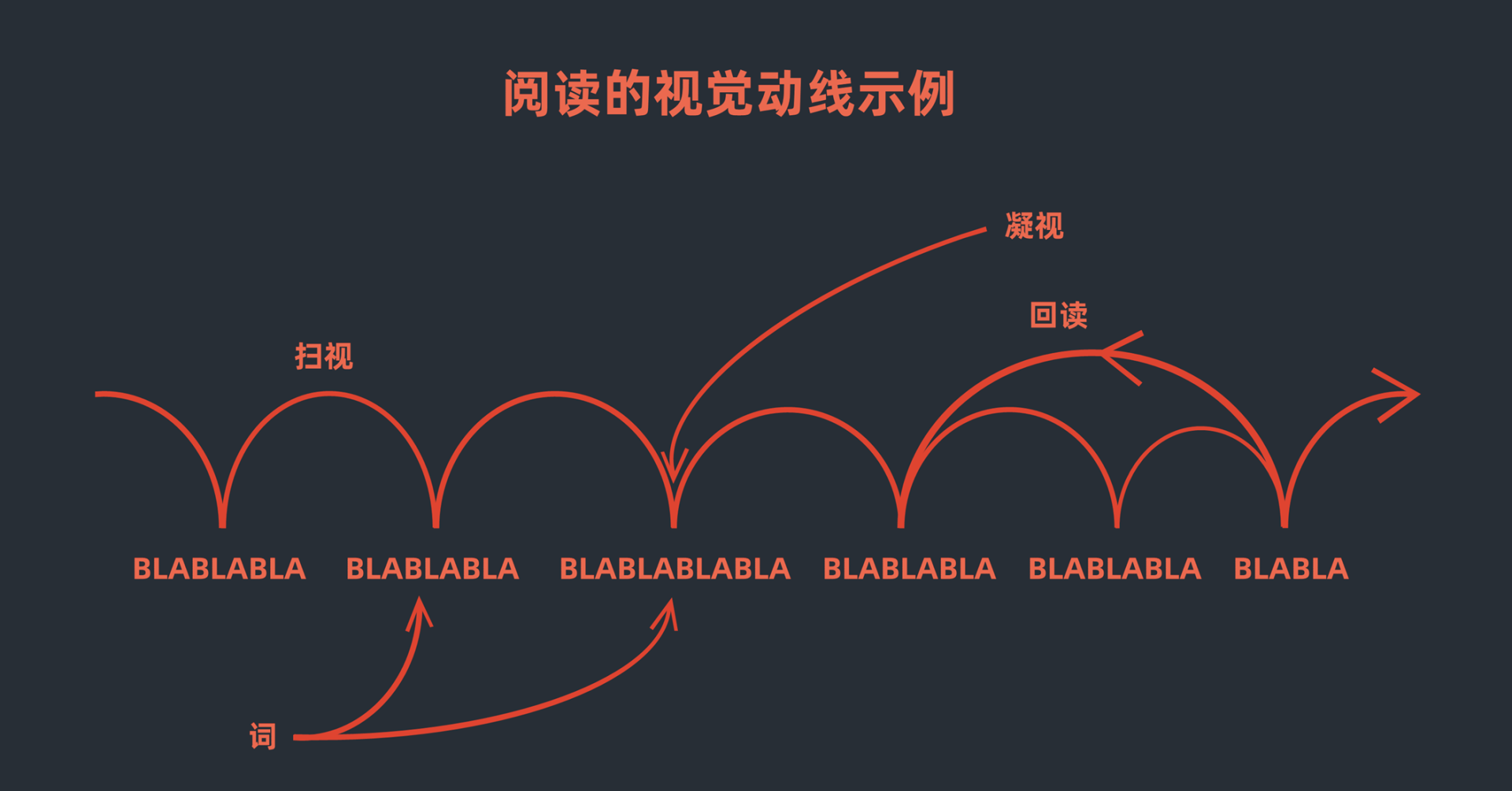 其实情况没有那么简单。即便是一段文字,我们的视觉扫视过程也是跳跃式的。我们会通过扫视、凝视的方式去阅读,甚至还有10%15%的情况是在回读。人一次扫视的跨度一般是79个字符。