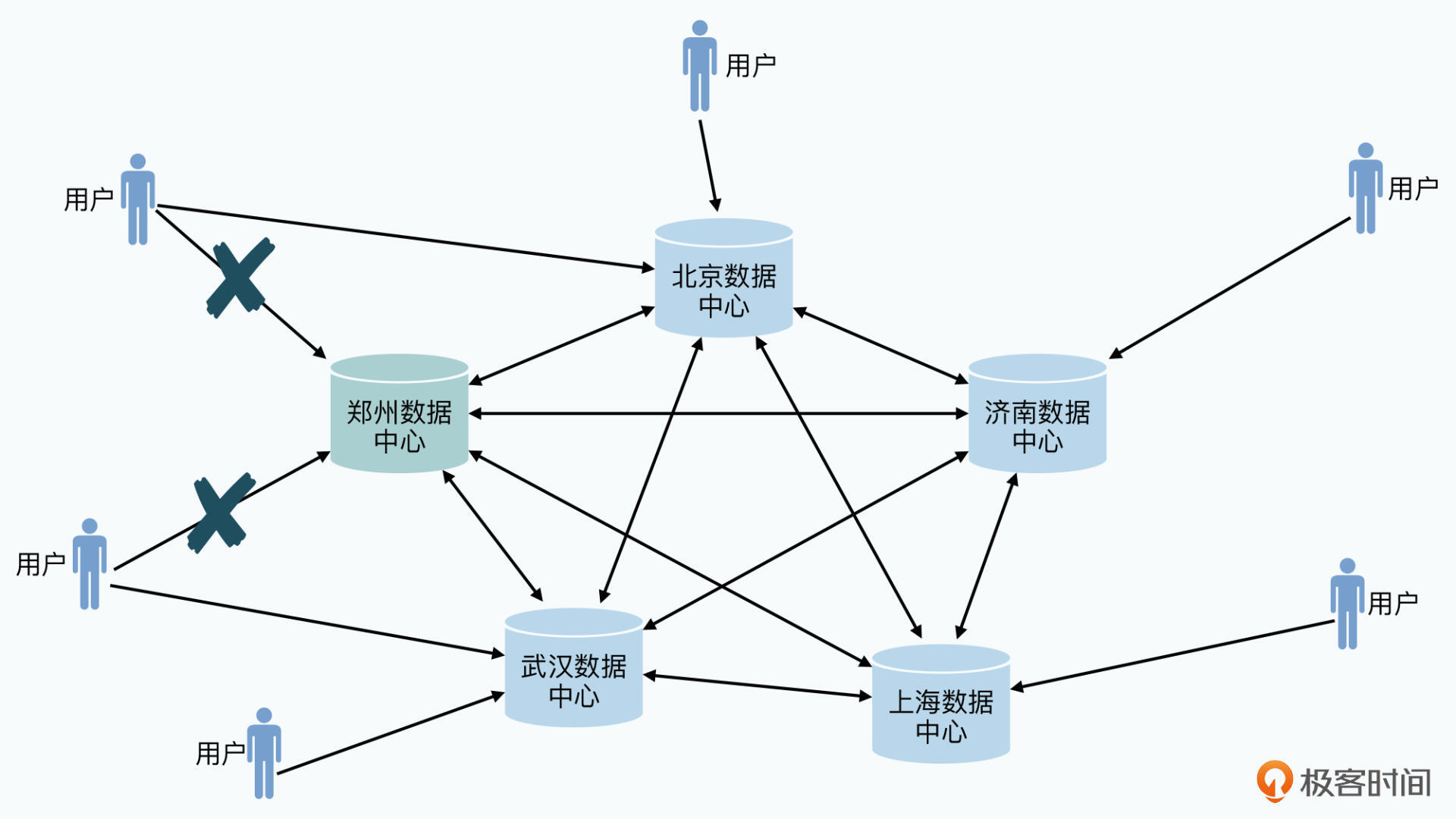 可是,如果我们的分布式数据库只能在一个数据中心里,那无论是在“可用性”上,还是在“性能”上,在互联网时代都有点不够看。