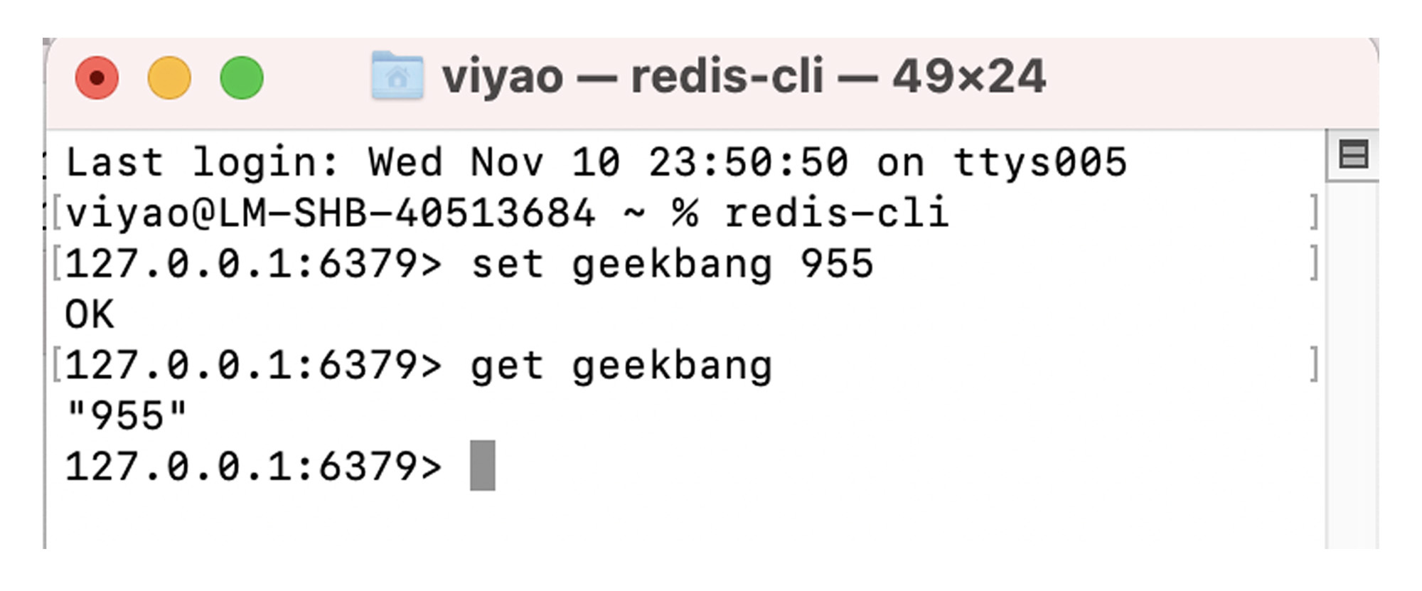 在控制台中,你可以尝试通过set命令设置一个key-value键值对,并使用get命令读取key对应的值,通过这种方式来验证Redis是否正常工作。在下面的图中,我通过set命令设置了一个key=geekbang,value=955的键值对,然后使用get命令去读取geekbang的值。