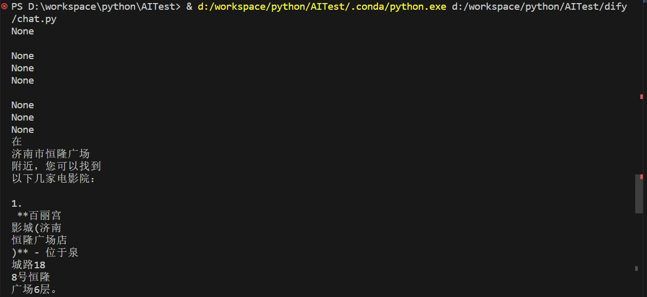 首先,从环境变量中读取 API Key,这是因为我已经提前将地图助手的 API Key 放到我的环境变量中了。之后还要设置 base_url 为你的 Dify 服务地址。之后在初始化 client 后可以直接通过 create_chat_message 与地图助手对话。由于对话采用流式模式,因此最后需要循环解析返回的内容,并打印出来。注意一点,在第 18 行,设置了 decode_unicode 为 True,这就是前面我说到的需要对返回内容做 Decode 操作。