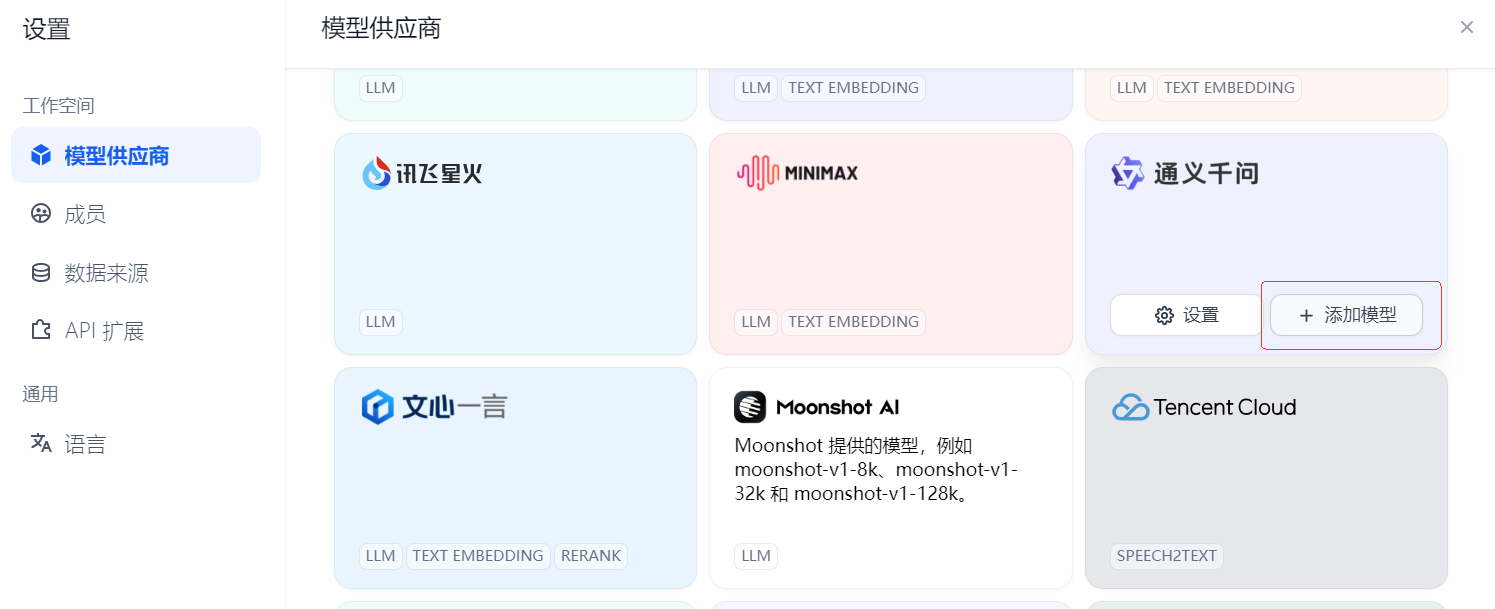 点开设置-模型供应商后,可以看到 Dify 支持了非常多的模型供应商,非常方便。在这里我使用的是通义千问,你可以根据自己的情况去选择合适的模型。