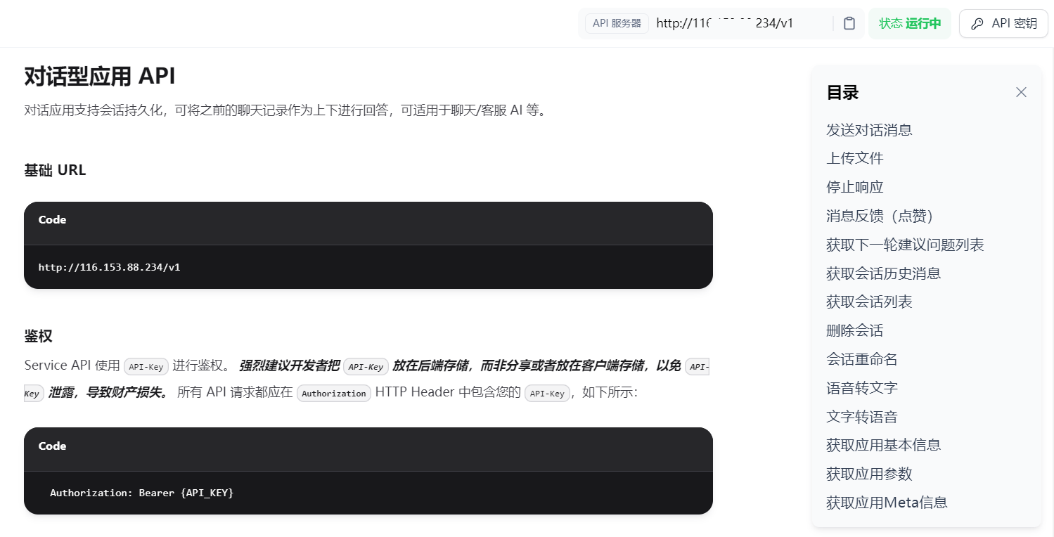 我们再来看一下访问 API 方式。Dify 提供了如下图所示的一系列的标准 API 文档,覆盖了与大模型应用对话的全部功能,用户只需要针对每一个应用拿到对应的 API key,就可以通过 API 与应用进行交互。