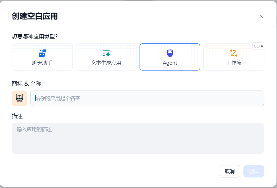 完成模型设置后,点击创建空白应用,选择 Agent,此时可以输入名称和描述,点击创建按钮,进入到 Agent 应用配置页面。