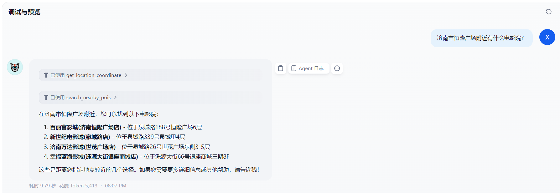 最后我们在调试窗口测试一下效果,如下图所示,可以看到 Agent 调用了我们的两个工具,输出了正确的结果。