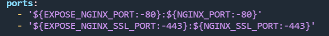 如图所示,Nginx 的暴露端口是可以改动的,如果你的 Linux 服务器的 80 端口被占用了,可以将 EXPOSE_NGINX_PORT 后面的 80 改成其他的端口。除此之外,无需进行其他修改。