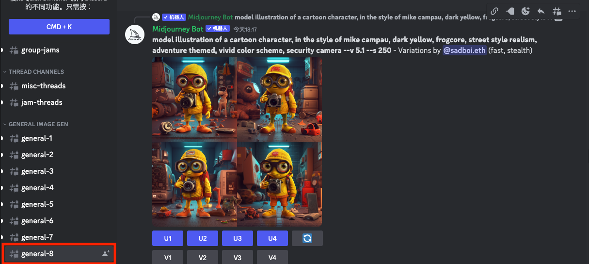而且,这样的聊天室并不仅仅局限于新用户。Midjourney同样也为老用户设置了general频道,你在里面一样可以看到老玩家们绘制的优秀画作。