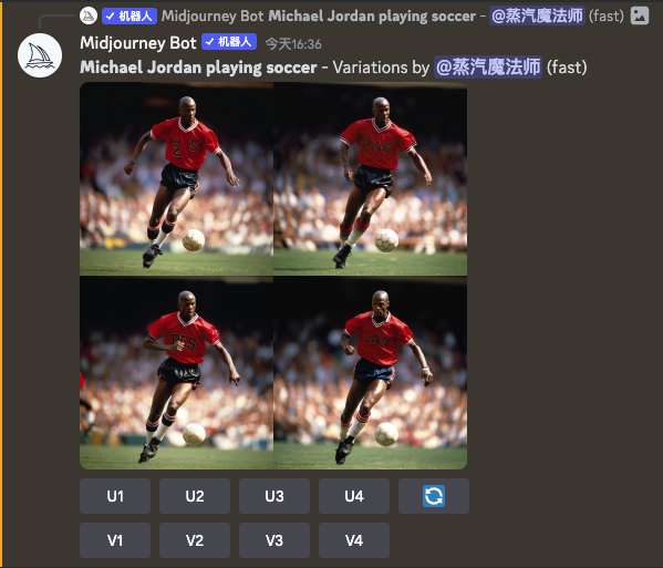 此外,针对每次你输入的提示语,Midjourney并不是为你直接生成一张高清晰度的大图,而是生成了4张不同的图片。这其实也是为了弥补Diffusion类型算法的一个缺陷,就是生成的图像可控性比较差,一次性就能拿到我们满意的图片的概率比较低。比如,我们这里输入的“Michael Jordan playing soccer”是想要生成迈克尔乔丹踢足球的照片。但是里面右下角的第四张图里,显然还是一个打篮球的姿势,只是把手上拿着的篮球换成了足球而已。而一次性提供四张图片,让用户可以从四张里面挑一张,显然成功率就高多了。