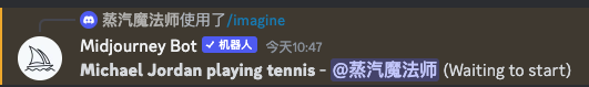 首先,在你的提示语提交之后,Discord里面的Bot会告诉你,目前的任务是处于 Waiting to start 的阶段的。