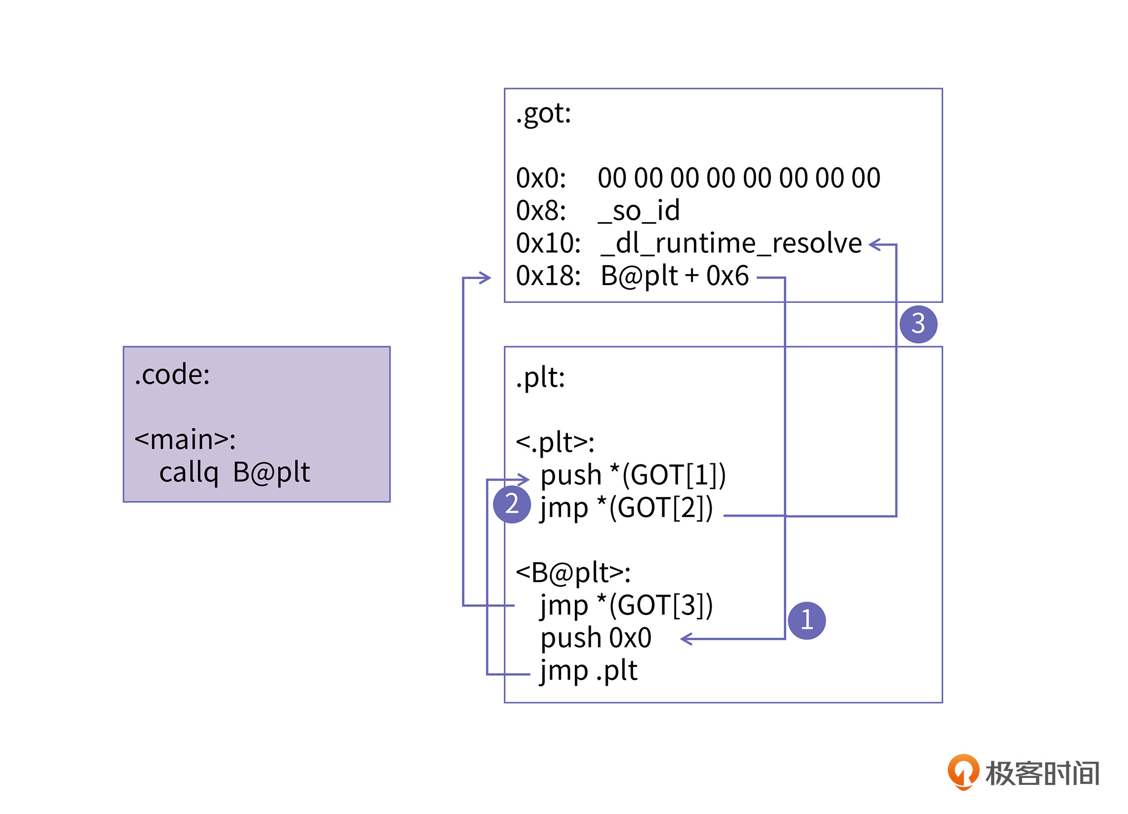 在图中,我用序号①、②、③和它们旁边的箭头分别给你标注出了三级跳的路径。如果你仔细观察的话,你还会发现这张图与上一张图的主要变化就是引入了.plt段,在代码段里,main函数对B函数的调用转成了对”B@plt”的调用,”B@plt”函数只有三条指令。