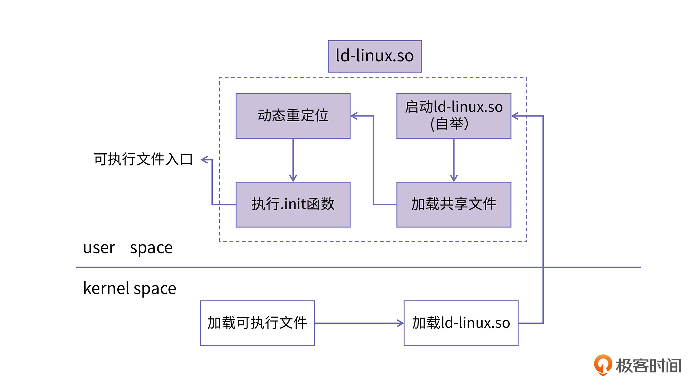 动态链接会把不同模块之间,符号重定位的操作,推迟到程序运行的时候,而ld-linux.so就负责这个工作。所以我们经常称ld.so为动态链接器,又因为它还负责加载动态库文件,所以我们有时也叫它loader,或者加载器。