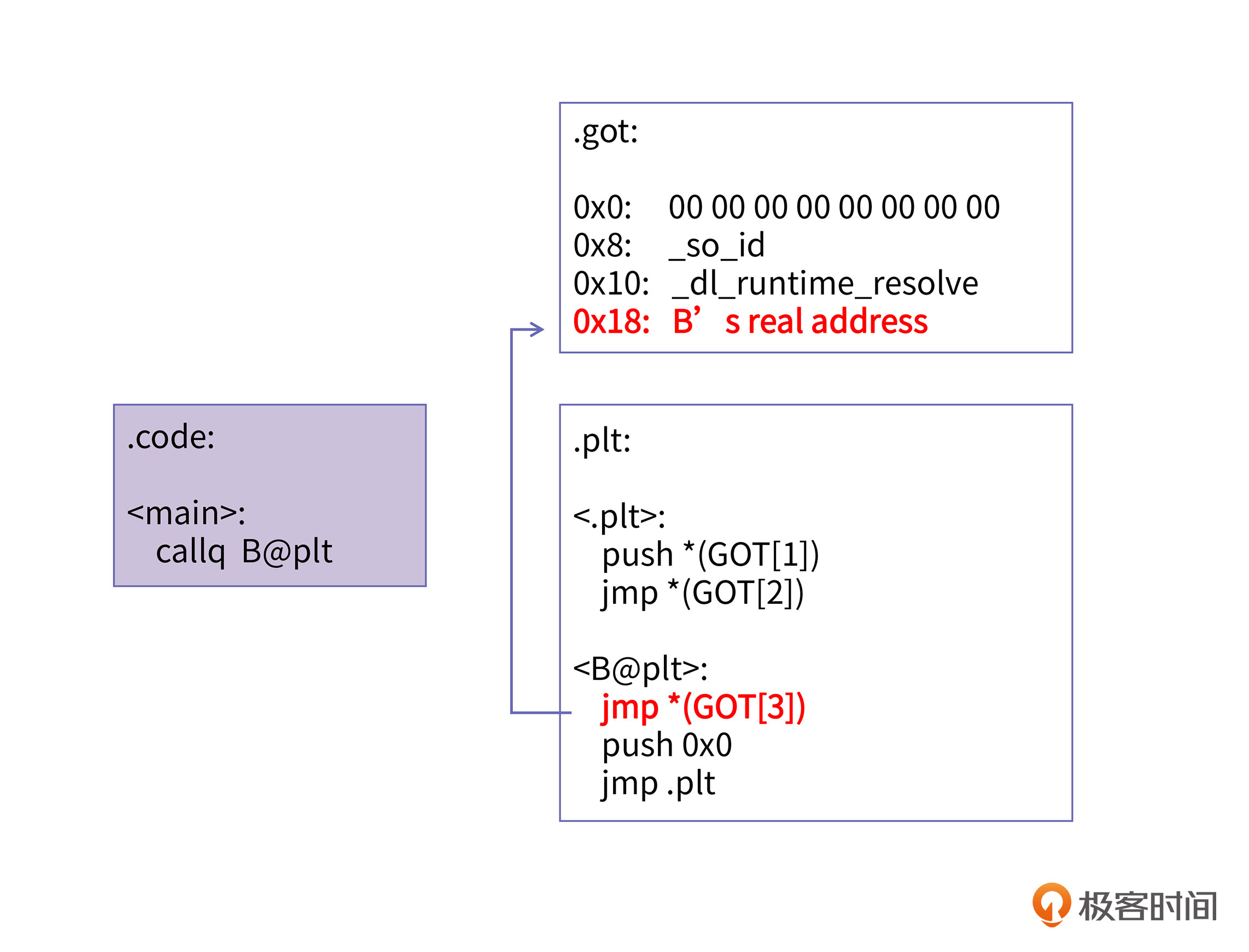 当执行完了重定位过程以后,CPU再一次运行到main里的call指令时,就能通过一次跳转就调用到真正的B函数了,这时的GOT已经与上节课所讲的加载时重定位后的GOT一模一样了。如图所示: