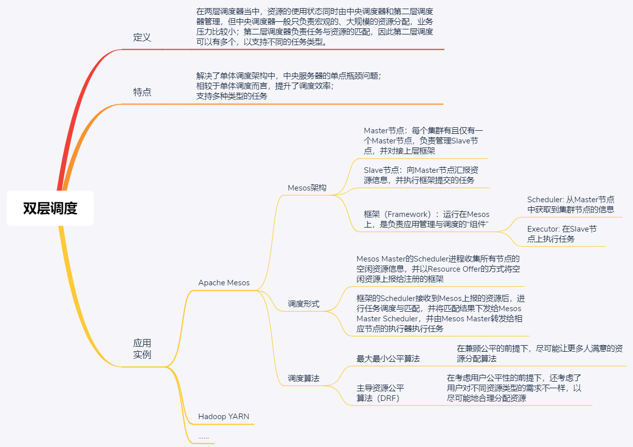 两层调度结构对应的就是两层调度器,资源的使用状态同时由中央调度器和第二层调度器管理,中央调度器从整体上进行资源的管理与分配,将资源分配到第二层调度器;再由第二层调度器负责将资源与具体的任务配对,因此第二层调度可以有多个调度器,以支持不同的任务类型。