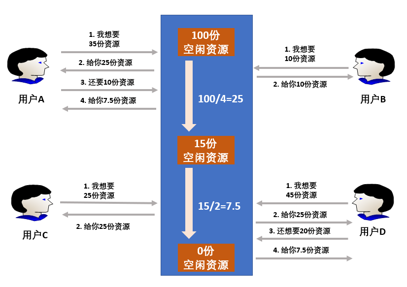 假设,现在有总量为100的空闲资源,有4个用户A、B、C、D对该资源的需求量分别为(35,10,25,45),分配流程如下所示: