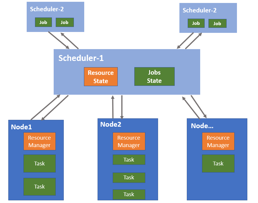 如下图所示,Scheduler-1表示第一层调度,负责收集和管理集群中的资源信息;Scheduler-2 表示第二层调度,Scheduler-1会将集群资源发送给Scheduler-2,然后Scheduler-2根据任务的资源需求和Scheduler-1发送的资源信息进行任务匹配和调度。