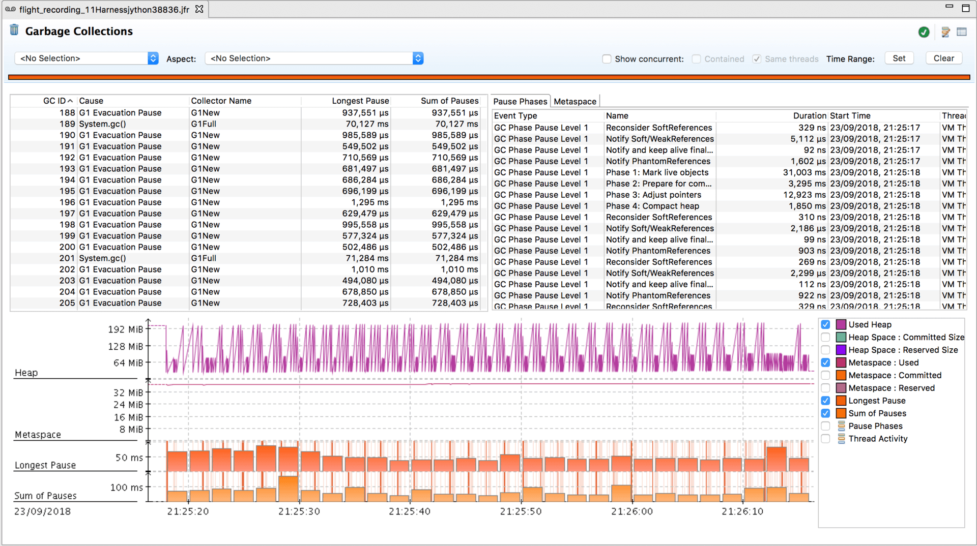 垃圾回收子系统所对应的选项卡展示了JFR所收集到的GC事件,以及基于这些GC事件的数据生成的堆已用空间的分布图,Metaspace大小的分布图,最长暂停以及总暂停的直方分布图。