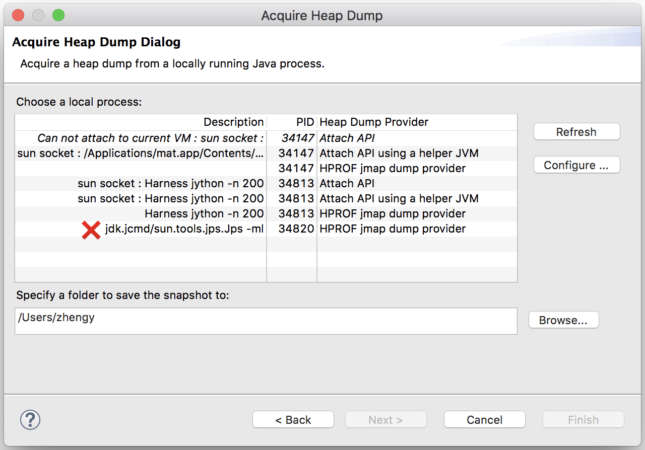 MAT本身也能够获取堆的二进制快照。该功能将借助jps列出当前正在运行的Java进程,以供选择并获取快照。由于jps会将自己列入其中,因此你会在列表中发现一个已经结束运行的jps进程。