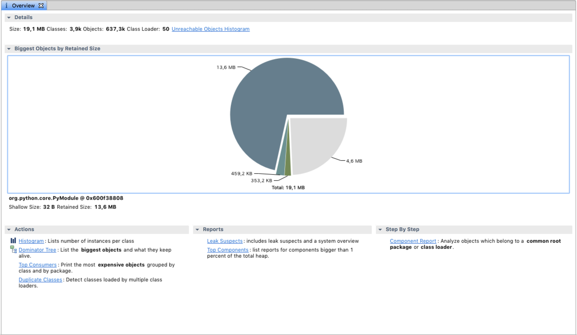 当加载完堆快照之后,MAT的主界面将展示一张饼状图,其中列举占据的Retained heap最多的几个对象。