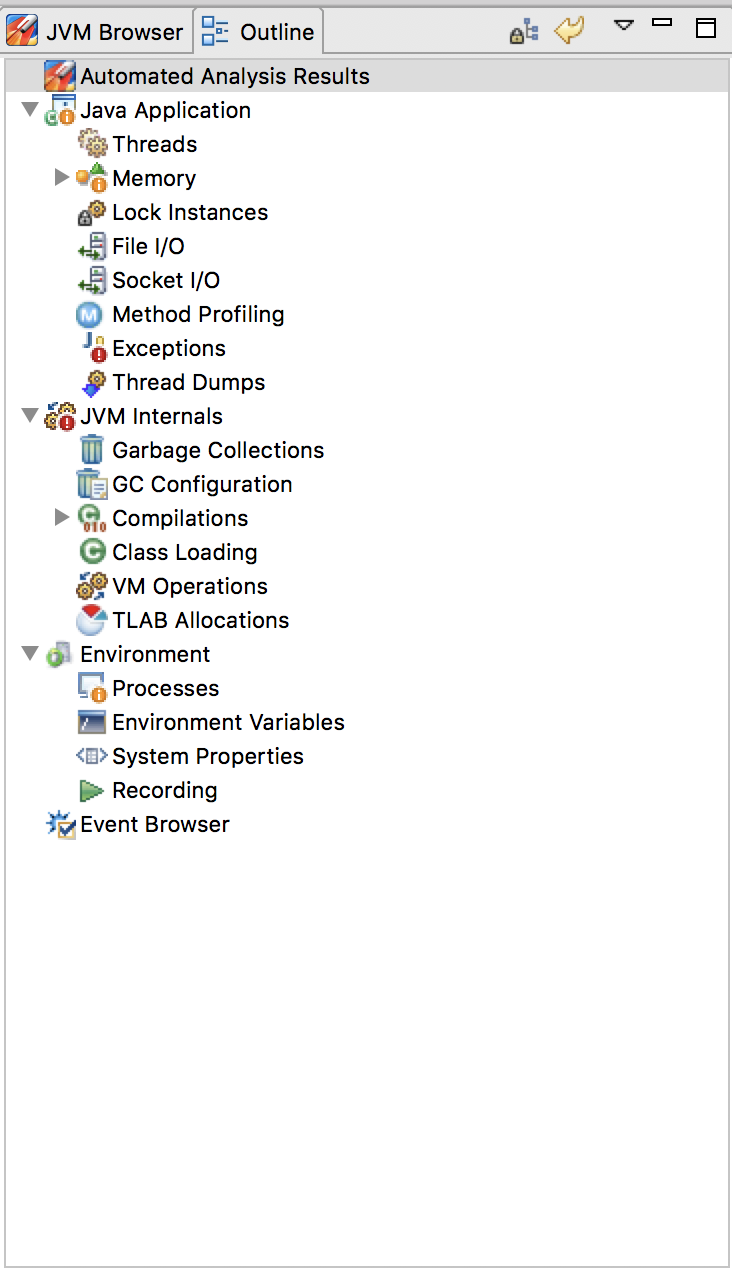 客户端的左边则罗列了Java虚拟机的各个子系统。JMC将根据JFR所收集到的每个子系统的事件来进行可视化,转换成图或者表。
