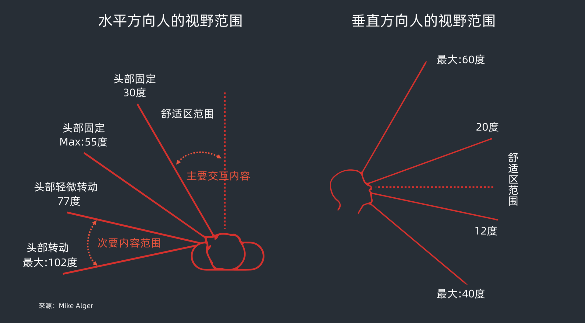 以上是人眼生理的极限,实际上头不动舒适的范围是左右各30度,再加上上20度,下12度。我们颈部不会下意识地运动,如果你通过头部运动,那么你的人眼舒适区域可以到154度到204度。