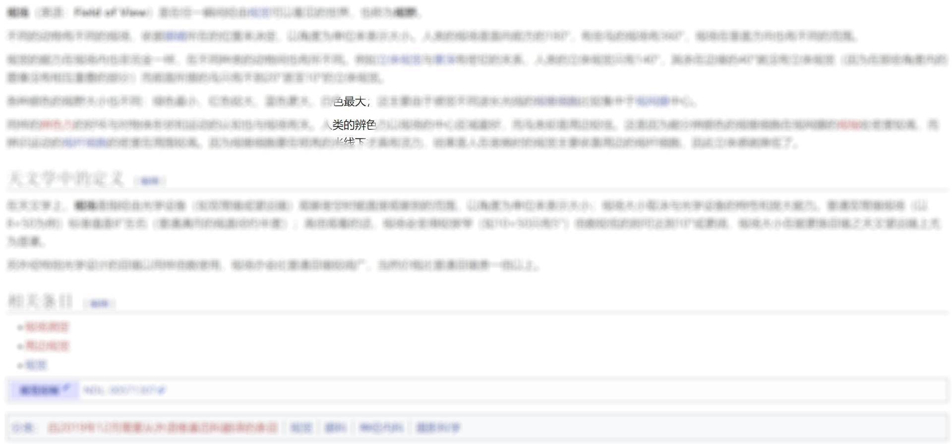 中央凹外围就是边界视觉,在边界视觉里人眼看不清图像,但可以分辨明暗。用图像压缩技术的话来说,在中央凹面积内你看到的是一个高分辨率的TIFF图像,而在其它的边界视觉面积里你只能看到低分辨率的JEPG图像。