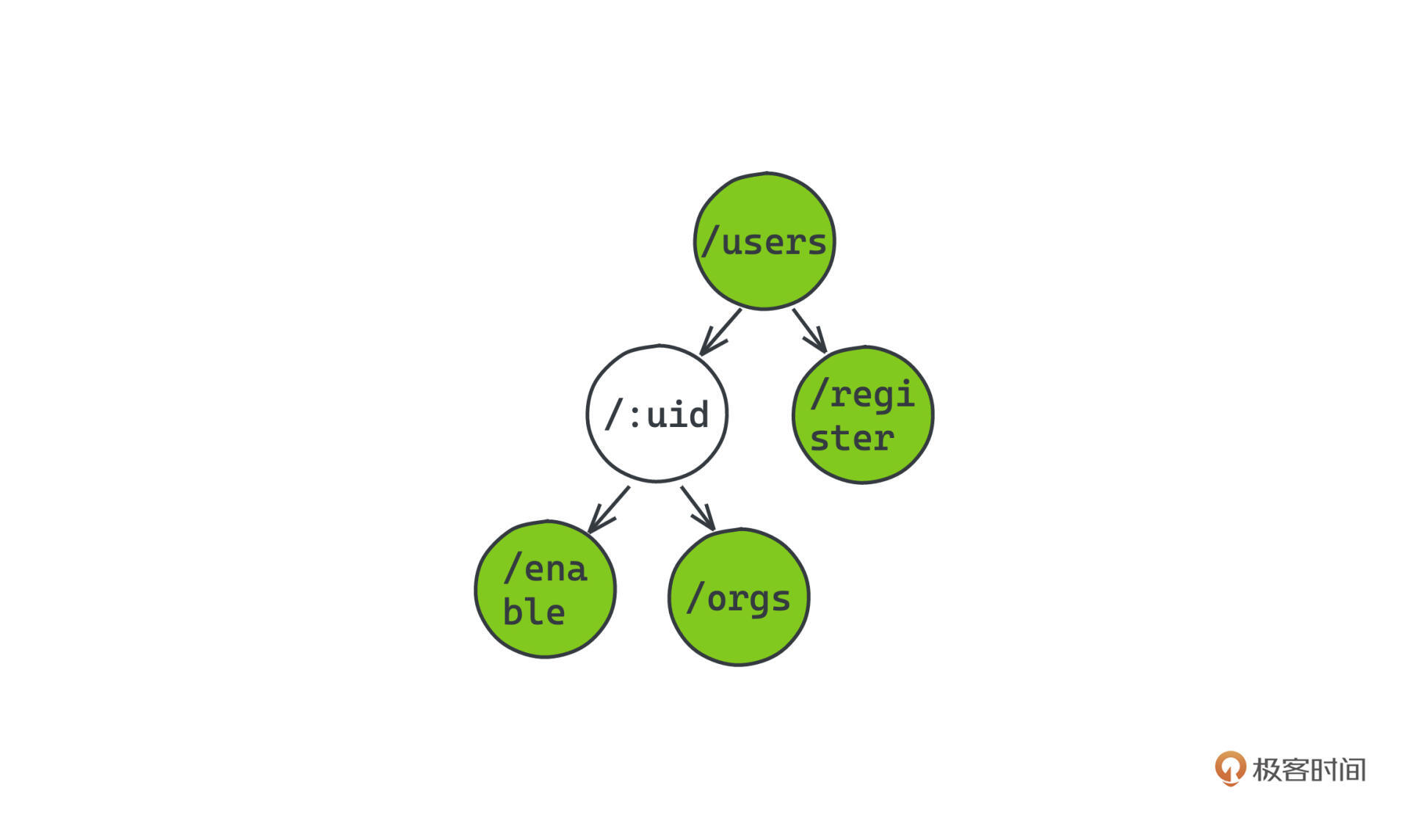首先对于静态路由,相信你应该已经猜到了,我们只需要稍作调整,从每个节点表示一个字符,变成每个节点表示路由被 / 分割的一节,比如图片里,我们就存储了两条静态路由 /users 、/users/register :
