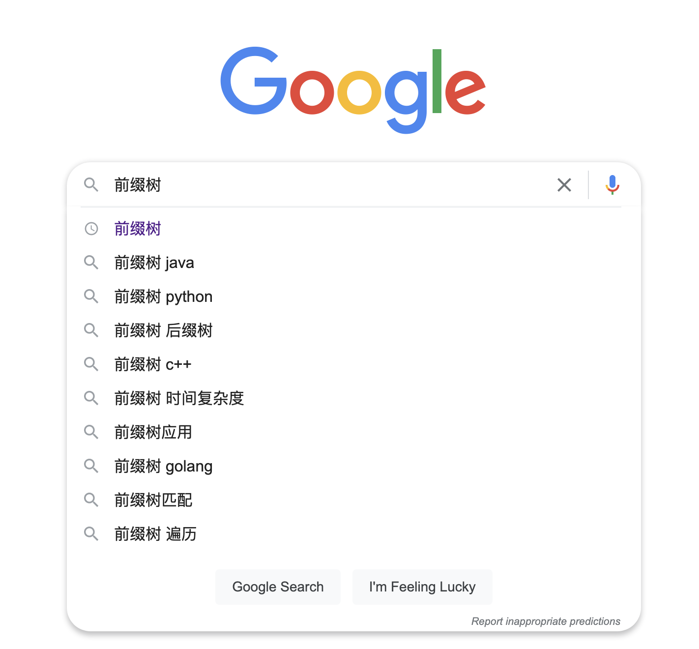 显然,相比于treemap来说,trie树存储的开销要小得多,并且因为它天然的前缀匹配和排序的特性,在很多时候也能帮助我们更快检索数据。最常见的比如在搜索引擎的网站中,我们有时候输入一部分内容,搜索框可能就会自动补全一些可能的选项,很多时候这个小功能的实现,用的就是前缀树前缀匹配的特性。