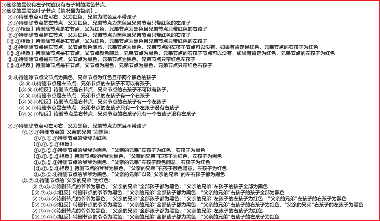 这种情况最繁琐复杂,需要细分好多种情况,因为黑色节点的删除意味着黑高度的变化(红黑树的失衡),此时通常会借助兄弟节点来让红黑树重新平衡。