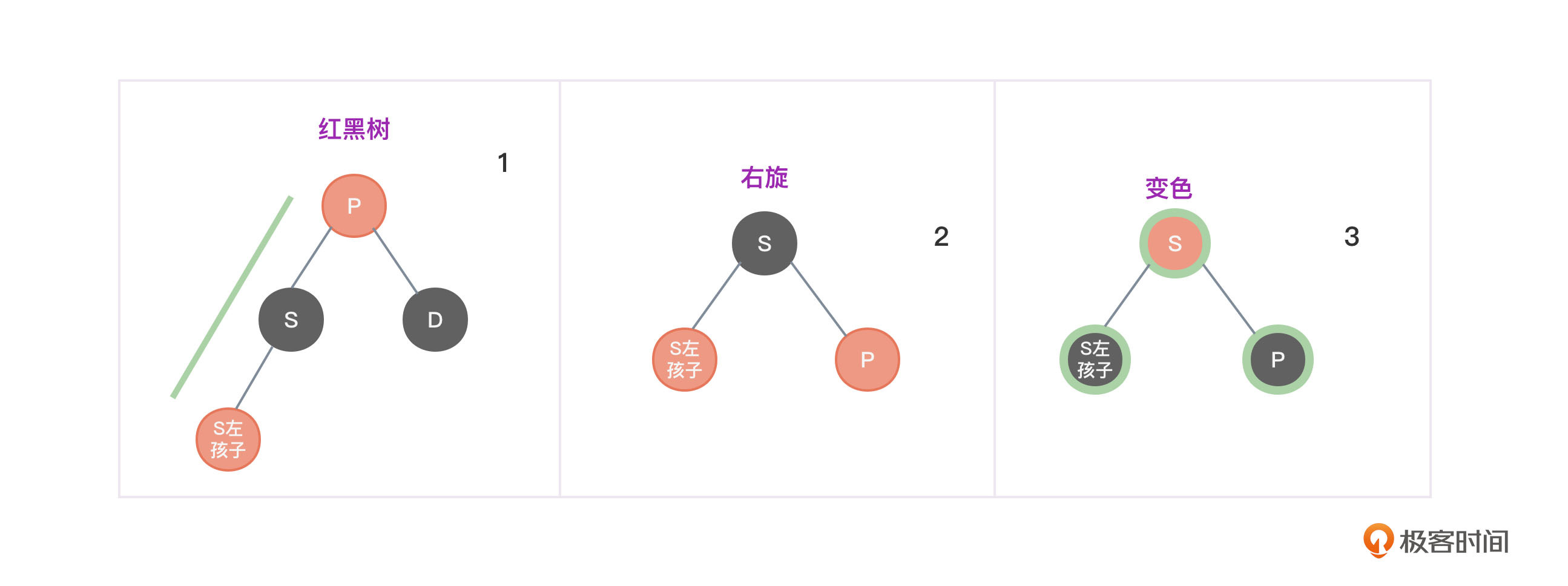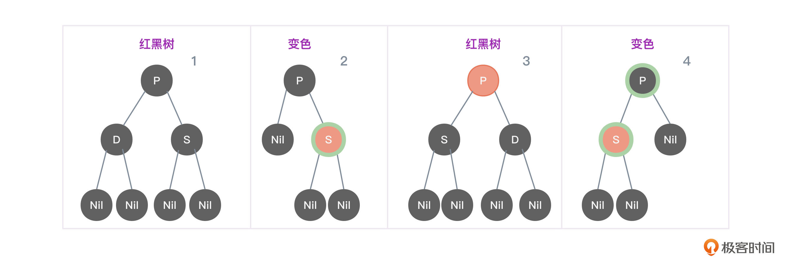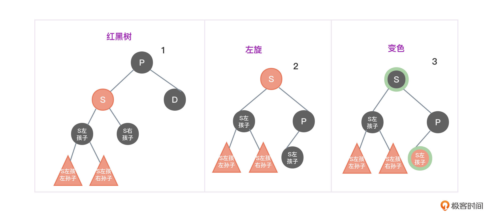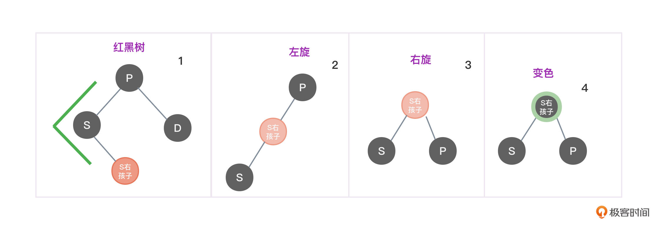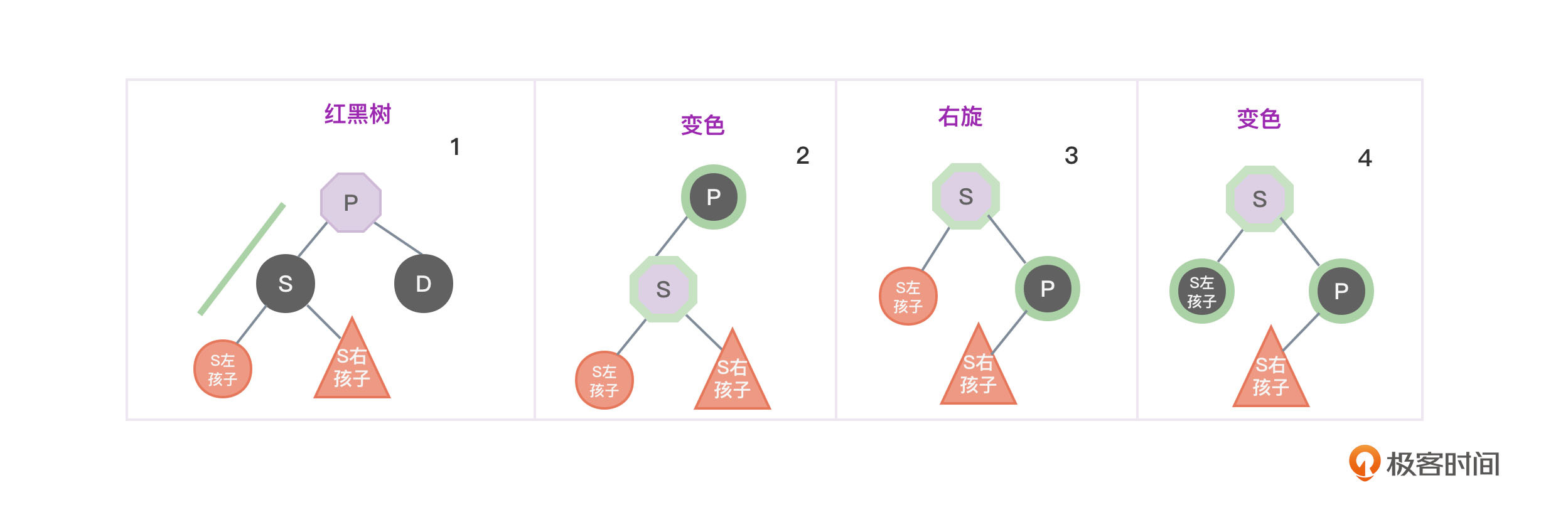 - 将节点P变成黑色,将节点S变成红色。如图3中的第2个和第4张图所示。