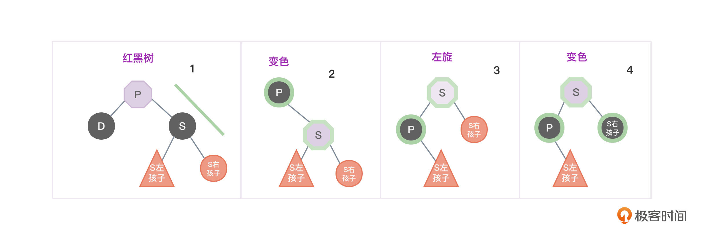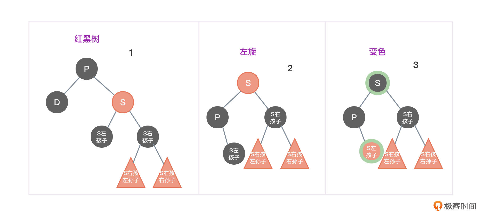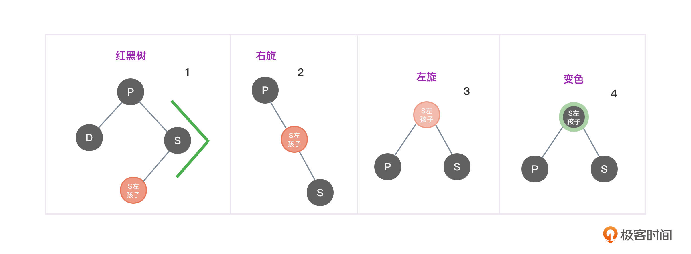 - 将S左孩子节点变为红色,将P和S左孩右孙子节点变为黑色,避免两个红色节点挨在一起。