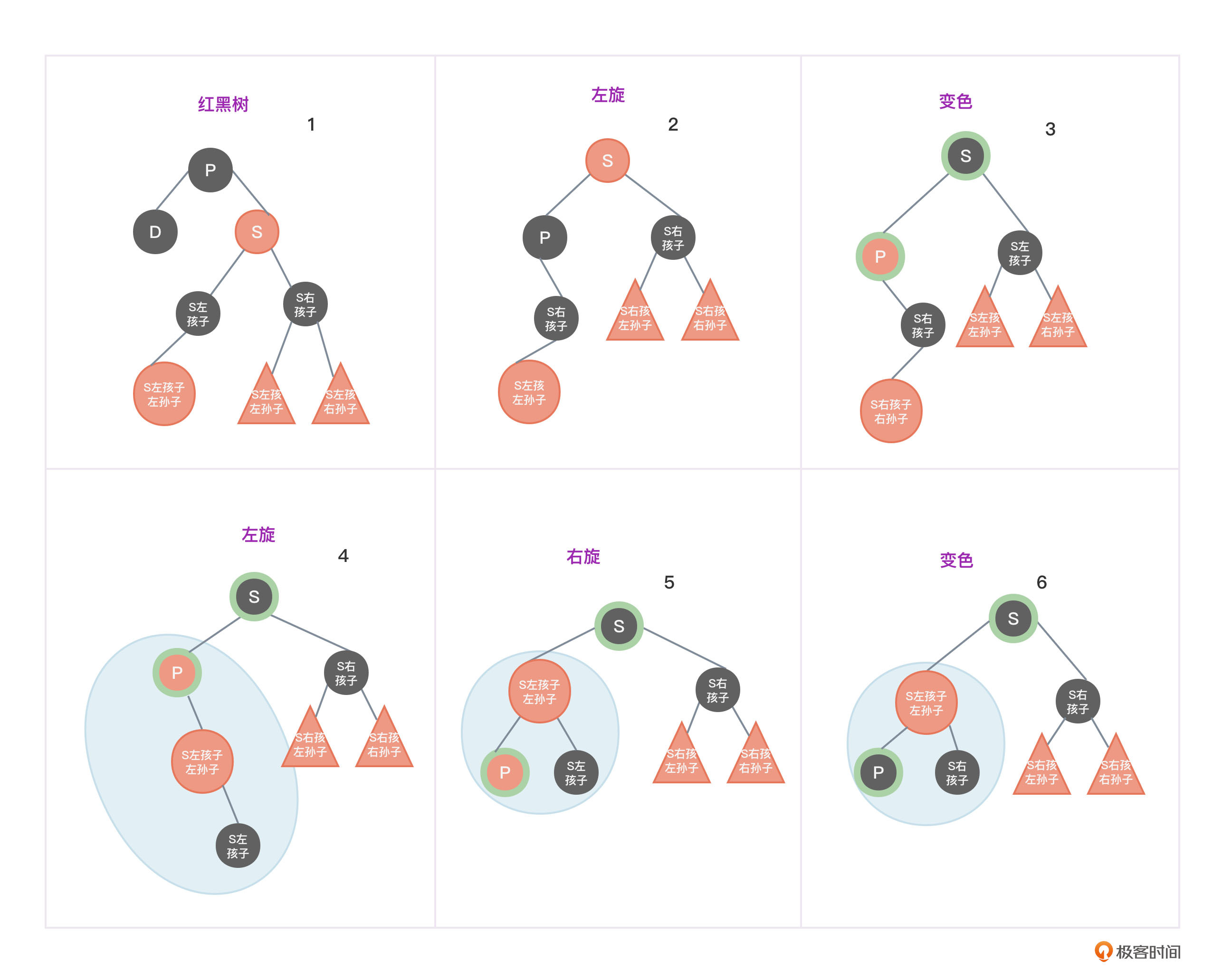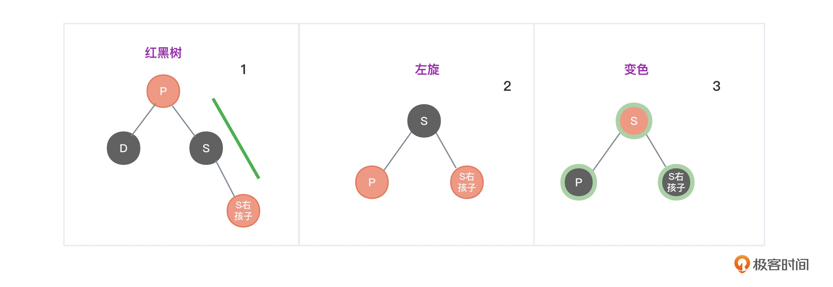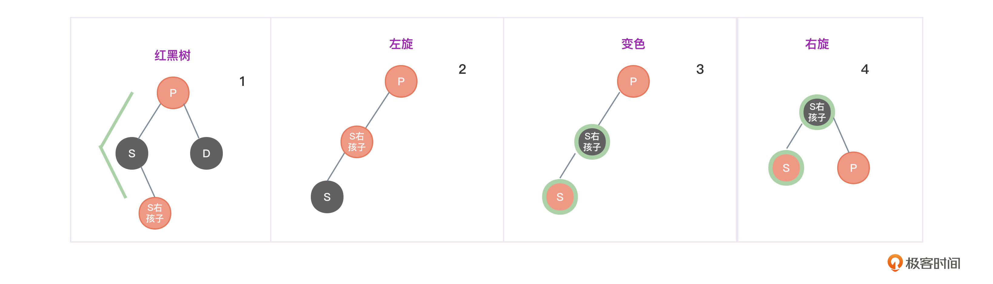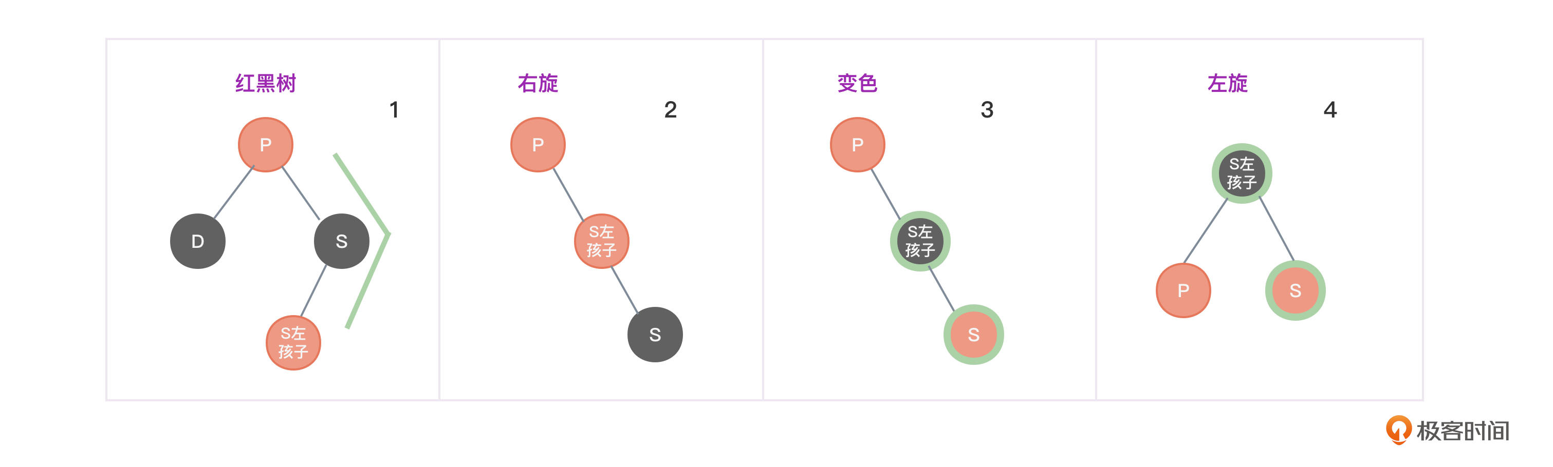 - 将S左孩子节点变为红色,将P和S左孩右孙子节点变为黑色,避免两个红色节点挨在一起。