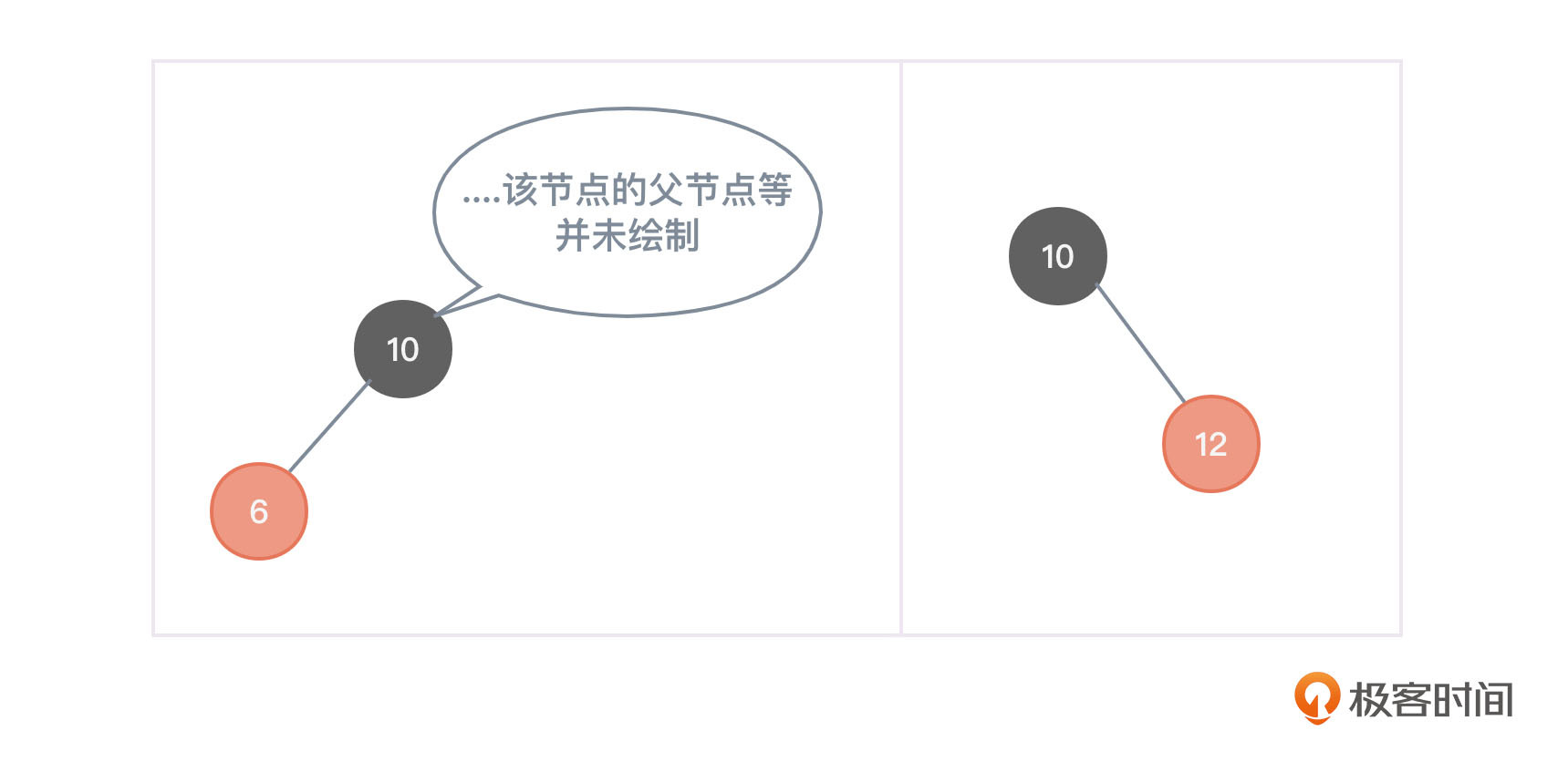 - 把节点10删除,让节点10的父节点的相应孩子指针指向节点6或者节点12,同时让节点6或者节点12的父节点指针指向节点10的父节点。