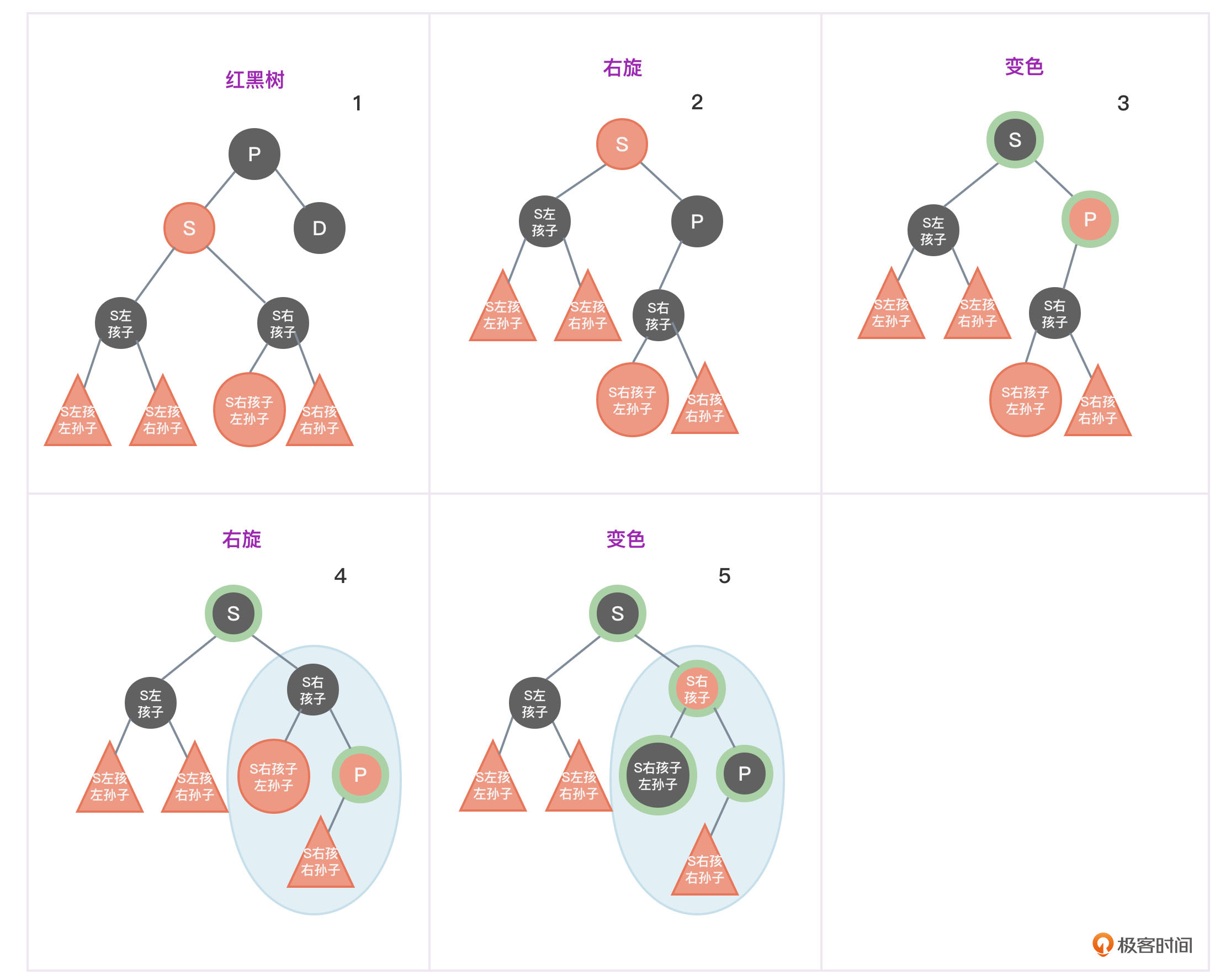 - 把节点S变成红色, S右孩子变成黑色,如图5中的第3张图所示。