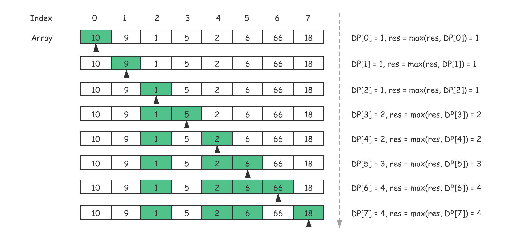 按照图示,如果我们用解决“最长连续递增序列”的思路设计一个 $res$ 变量来求解状态转移过程,那就是 $res = max(DP[7], DP[6])$,答案是 4。另外,我们考察一下 $DP[7]$ 的解是怎么计算出来的?其实,就是从 0 … 7-1 即 0 … 6 进行一个遍历,找出比 $nums[7]$ 位置小的数字,并形成上升序列,以此为基准计算出 $DP[7]$ 的长度。