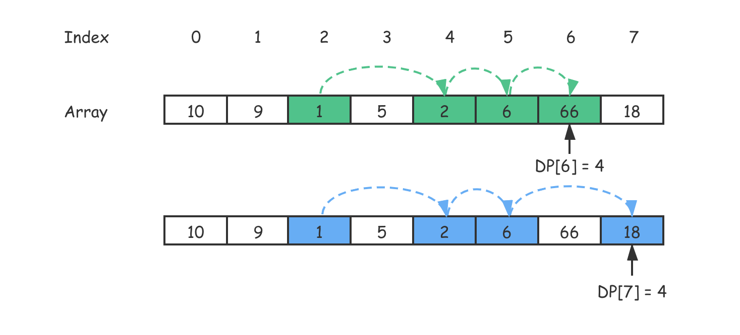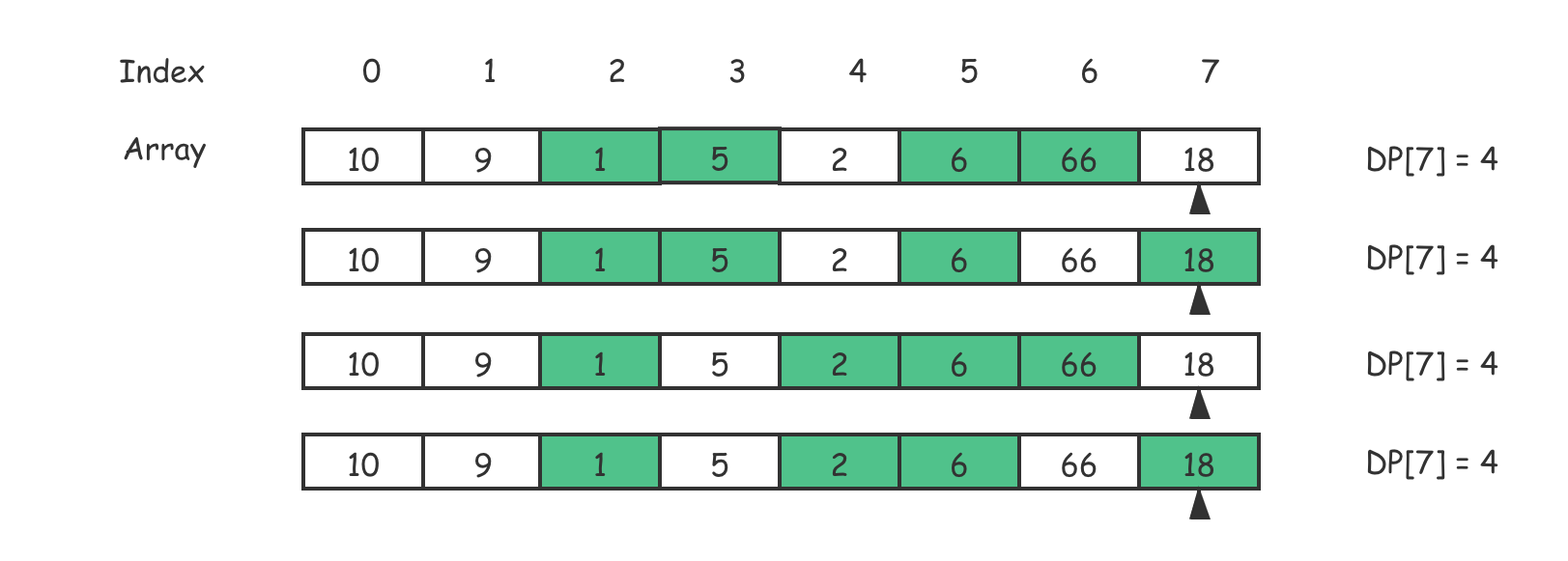 从图示中我们可以看出,有四种到达 $DP[7]$ 状态的最长上升子序列的长度均为 4。这意味着,由 [1, 5, 6, 66]、[1, 5, 6, 18]、[1, 2, 6, 66] 和 [1, 2, 6, 18] 构成的四个子序列的长度均为 4,它们都符合题设的要求。因此,对于这样的输入,最长上升子序列的数量是 4。