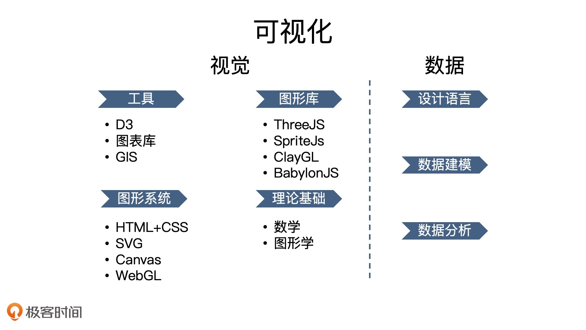 首先,想要学好可视化,我们就必须要了解可视化的体系都有什么。这里我画了一张知识结构图,你可以看看。