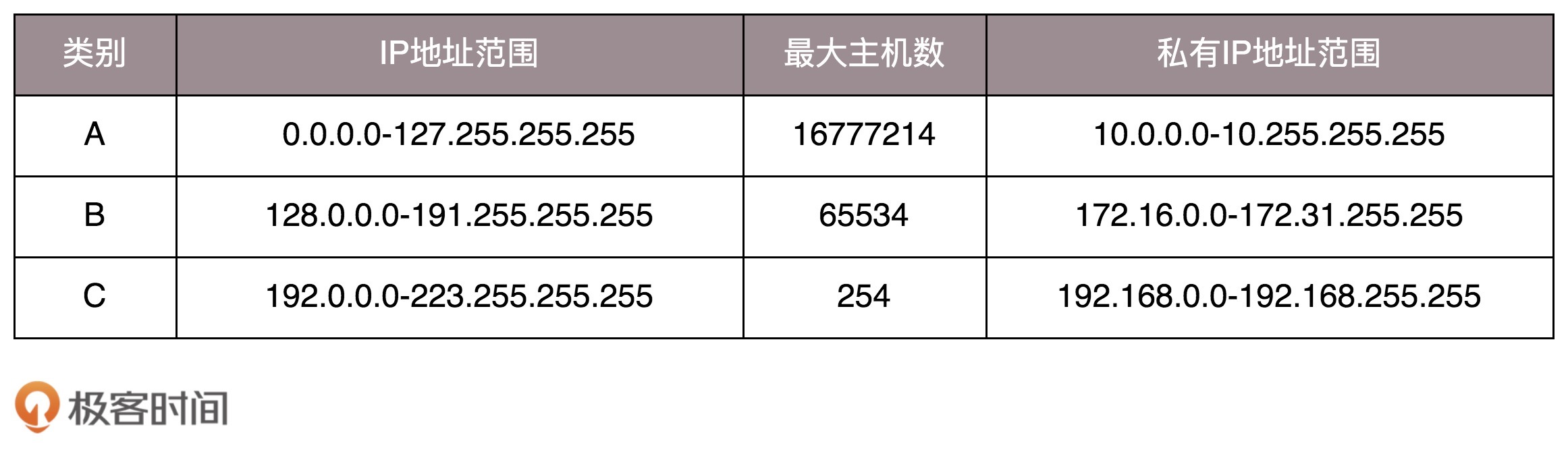 我们继续看上面的表格。表格最右列是私有IP地址段。平时我们看到的数据中心里,办公室、家里或学校的IP地址,一般都是私有IP地址段。因为这些地址允许组织内部的IT人员自己管理、自己分配,而且可以重复。因此,你学校的某个私有IP地址段和我学校的可以是一样的。