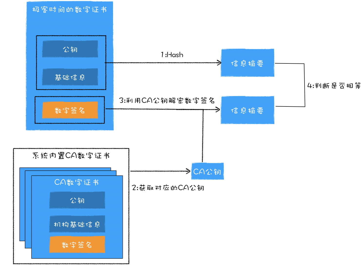 现在浏览器端就有了极客时间的证书和CA的证书,完整的验证流程就如下图所示: