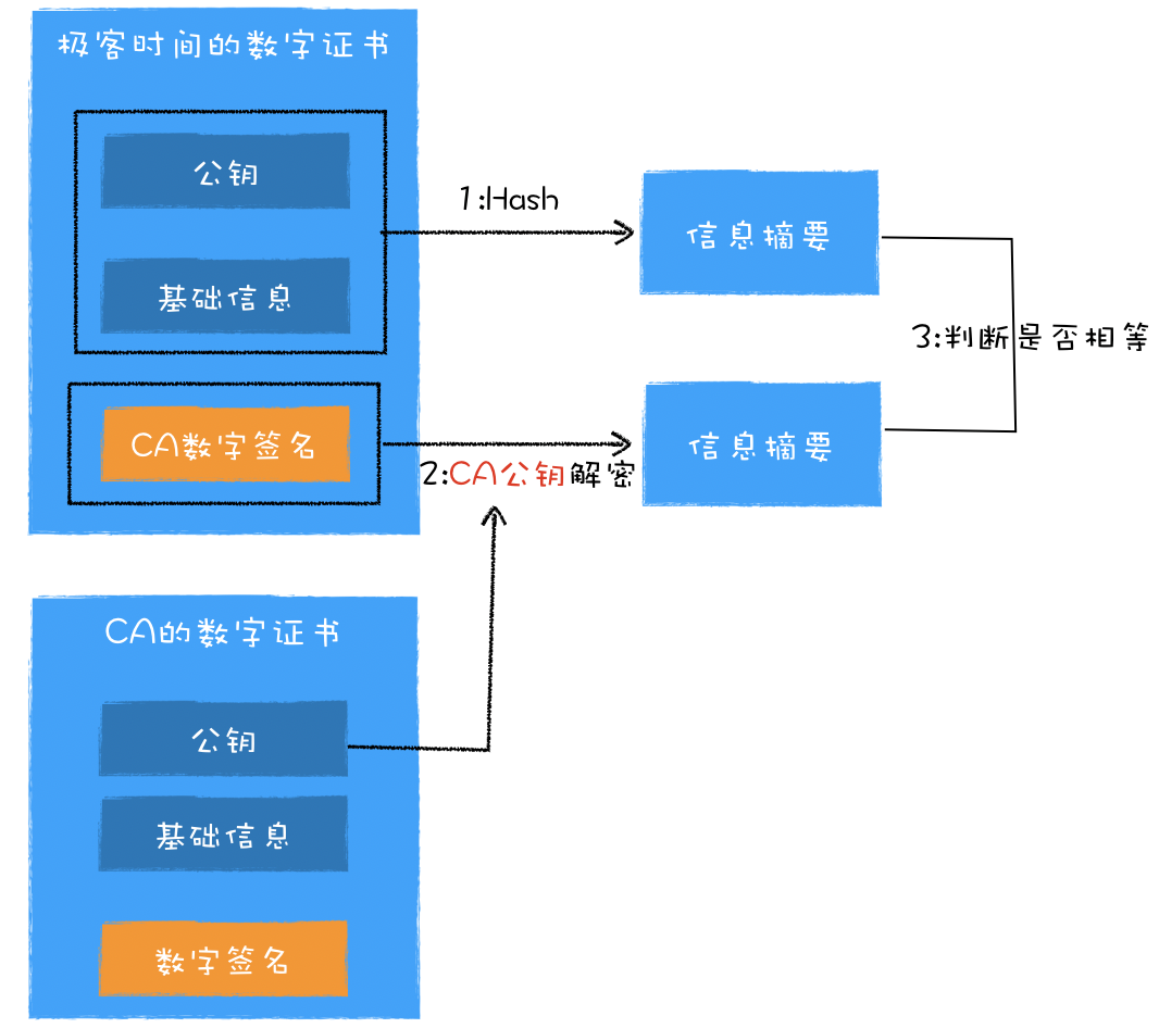 最后,还要**验证极客时间的数字证书是否是CA机构颁发的,**验证的流程非常简单:
