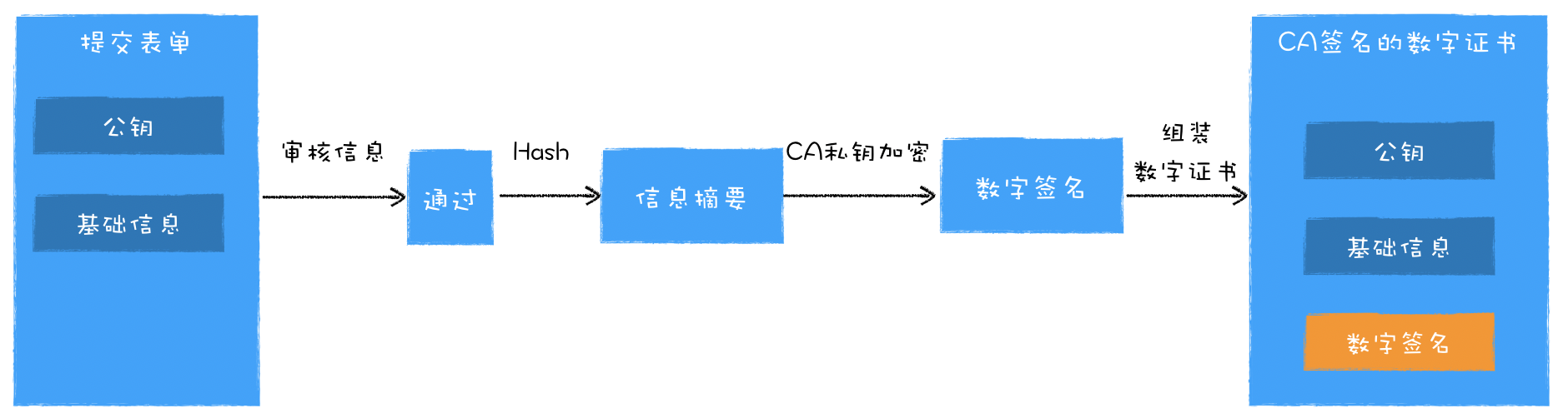 首先极客时间填写了一张含有自己身份信息的表单,身份信息包括了自己公钥、站点资料、公司资料等信息,然后将其提交给了CA机构;CA机构会审核表单中内容的真实性;审核通过后,CA机构会拿出自己的私钥,对表单的内容进行一连串操作,包括了对明文资料进行Hash计算得出信息摘要, 利用CA的私钥加密信息摘要得出数字签名,最后将数字签名也写在表单上,并将其返还给极客时间,这样就完成了一次数字证书的申请操作。