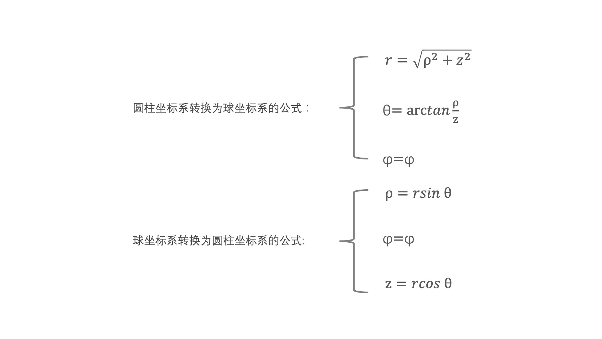 同样地,圆柱坐标系也可以和球坐标系相互转换,公式如下: