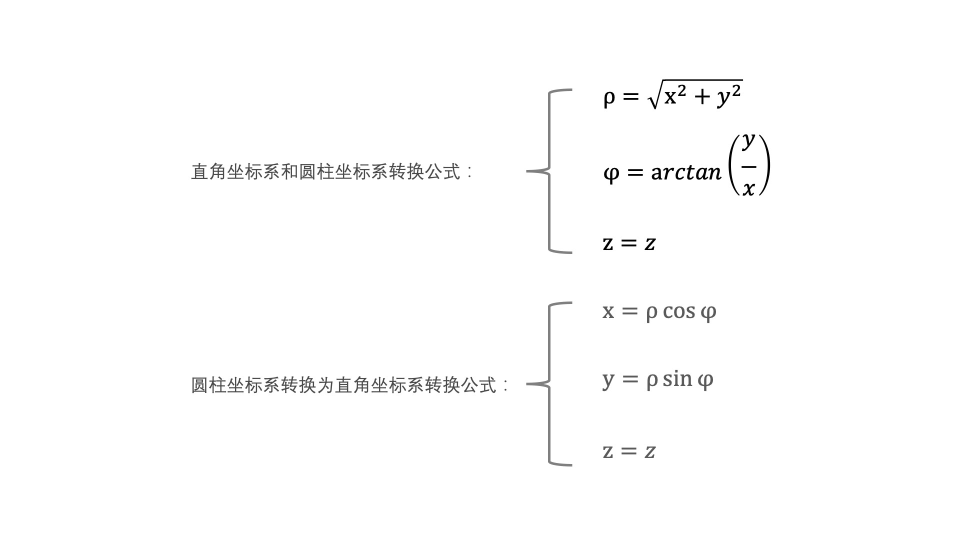 因为极坐标系可以和直角坐标系相互转换,所以直角坐标系和圆柱坐标系也可以相互转换,公式如下: