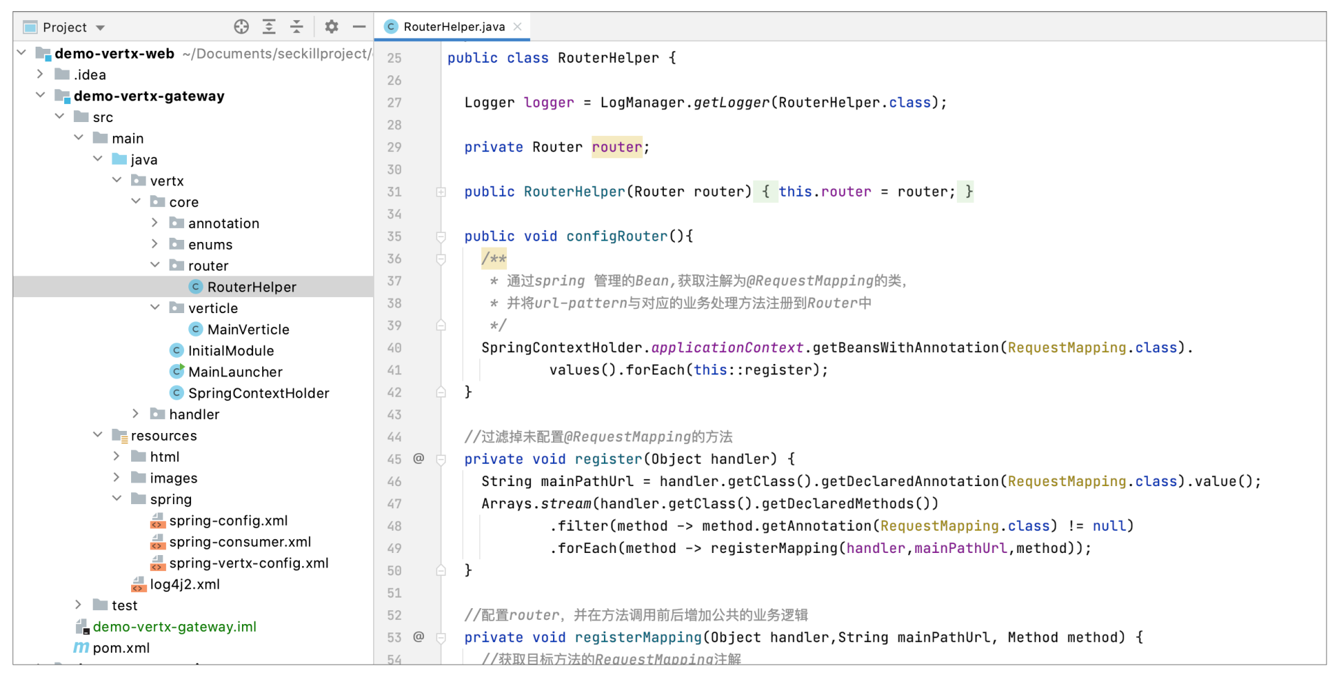 **第三步:**从上面可以看到,我们部署的实例是MainVerticle,在这里我们可以编排请求的处理流程,先看下代码,如下图所示: