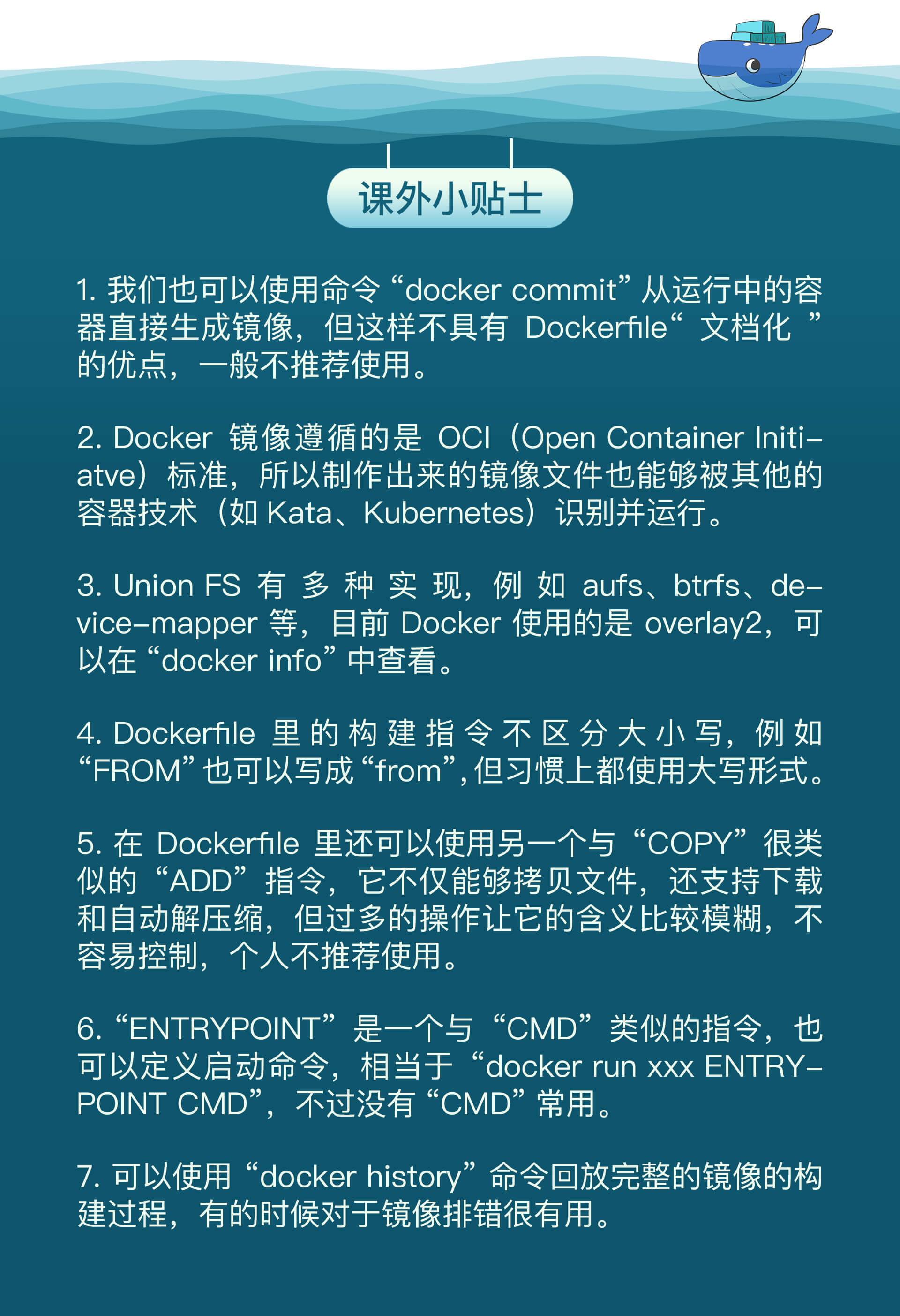 讲了这些Dockerfile指令之后,我还要特别强调一下,因为每个指令都会生成一个镜像层,所以Dockerfile里最好不要滥用指令,尽量精简合并,否则太多的层会导致镜像臃肿不堪。