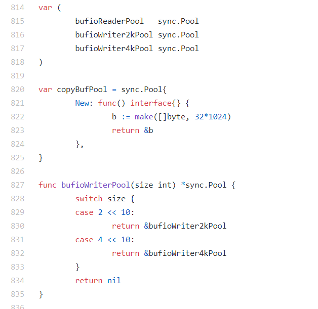 在标准库 net/http/server.go中的代码中,就提供了2K和4K两个writer的池子。你可以看看下面这段代码: