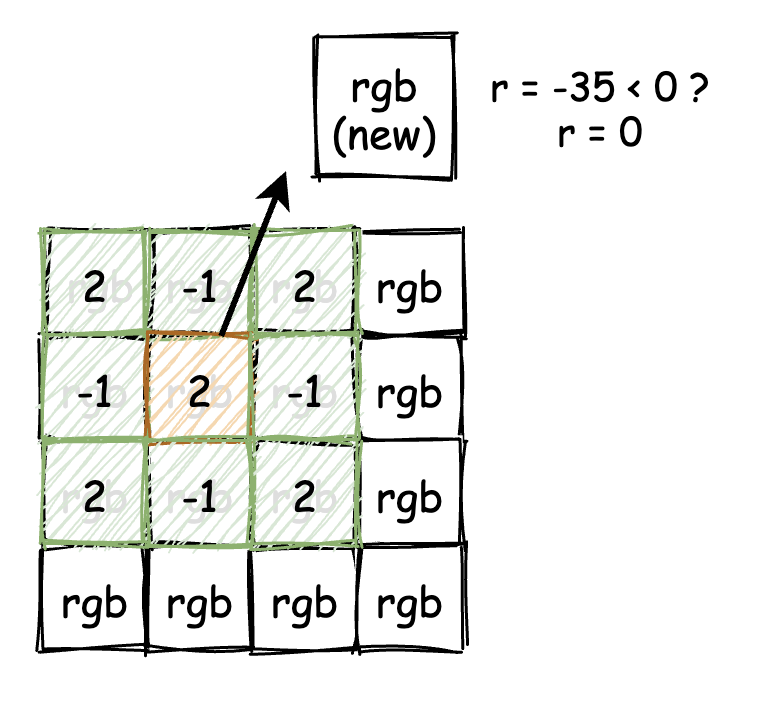 可以看到,这个分量值在经过卷积计算后的结果值为 -35。但别急,相信你已经发现了不对的地方。一个 RGB 分量的有效取值范围为 [0, 255],而负数则明显是不正确的。