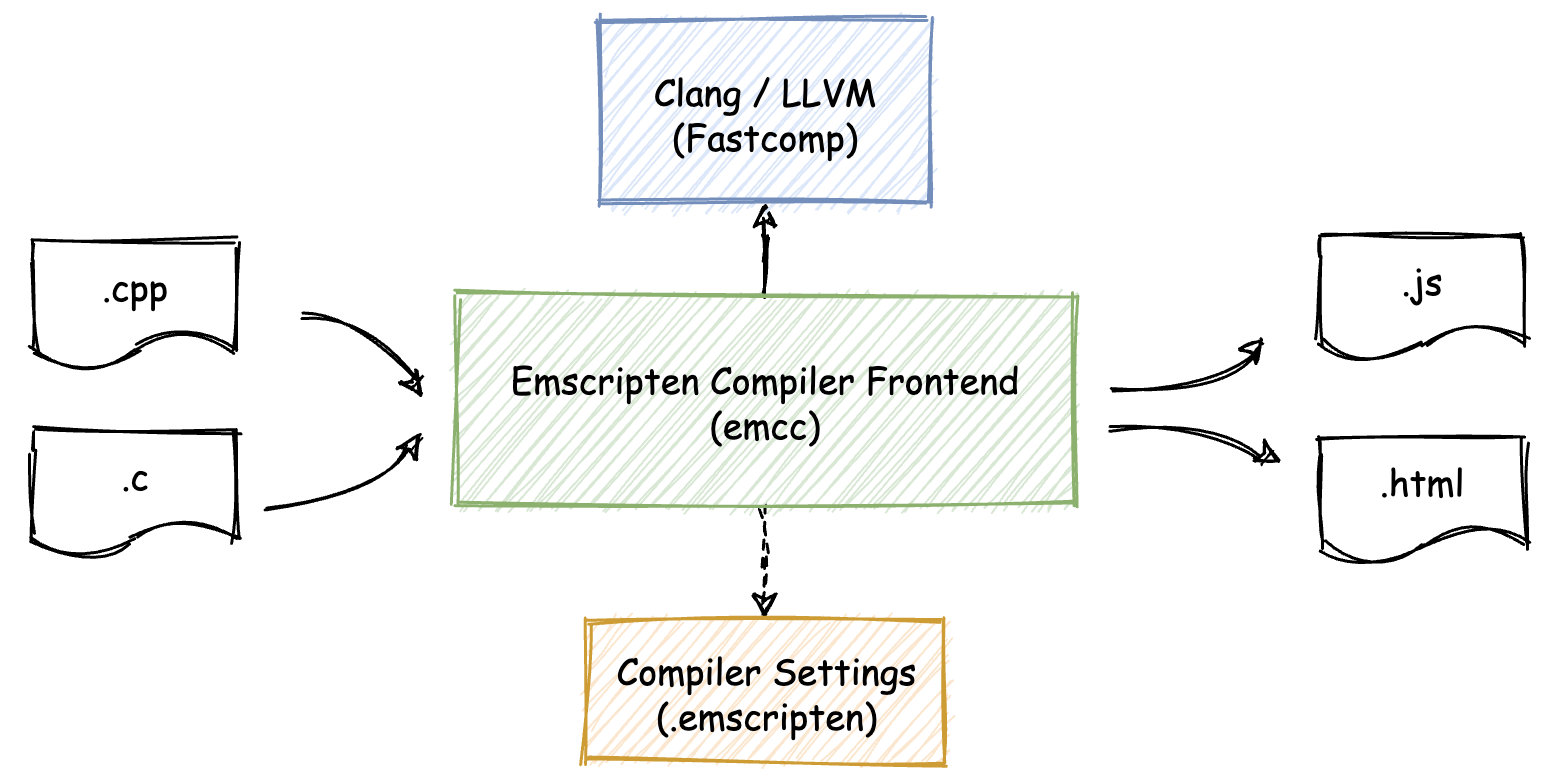 需要注意的一点是,在上图中你可以看到一个名为 “Fastcomp” 的组件,这个组件是 Emscripten 在旧版本中用于生成 ASM.js 代码的编译器后端,当然它也兼有生成 Wasm 代码的功能。