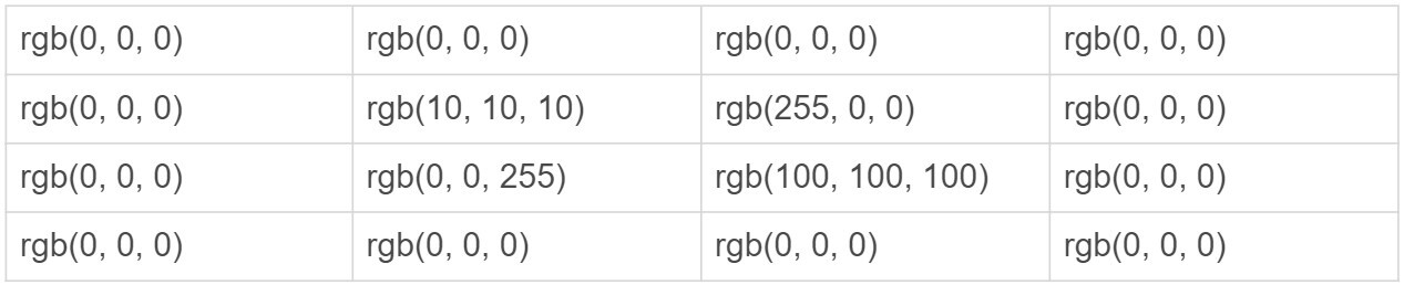 按照步骤,第一步我们需要对该矩阵进行 180 度的旋转,但由于该矩阵是中心对称的,因此经过旋转后的矩阵与原矩阵相比,没有任何变化。接下来,我们给出如下一个 4 x 4 像素大小的图像,并使用上述卷积核来对此图像进行滤波操作。该图像中各像素点的 RGB 分量值如下所示: