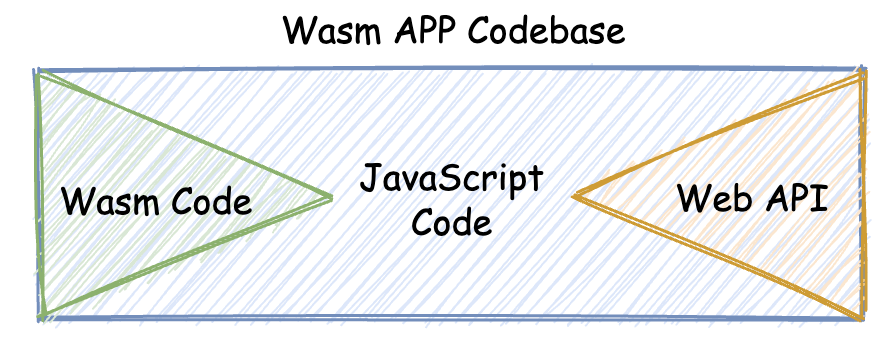 如下面这张图所示,通常一个完整的 Wasm Web 应用,都会由三部分组成,即:Wasm 模块代码、JavaScript 胶水代码以及一些对 Web API 的调用。