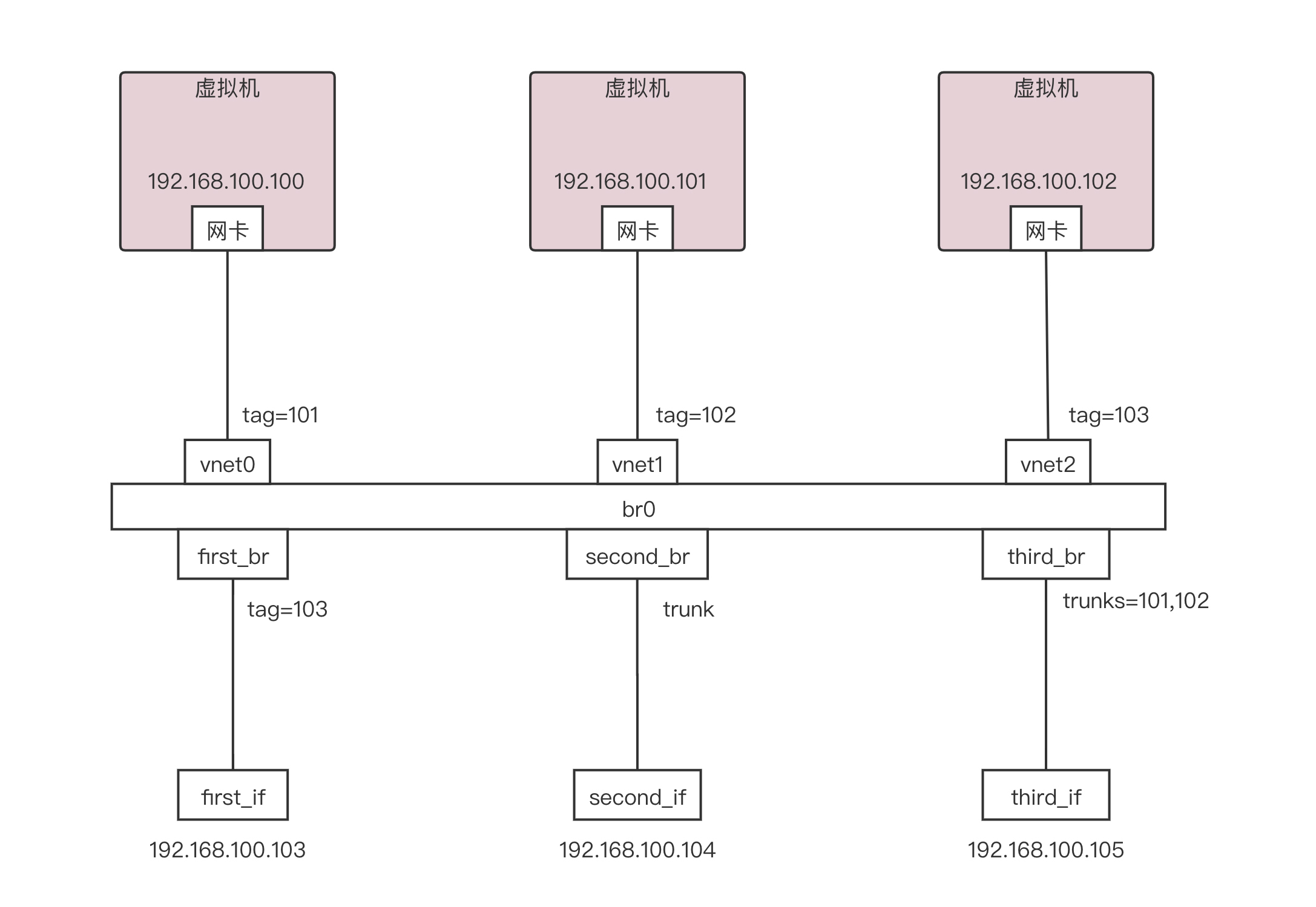 这样就形成了如下的拓扑图,有三个虚拟机,有三个网卡,都连到一个叫br0的网桥上,并且他们被都打了不同的VLAN tag。