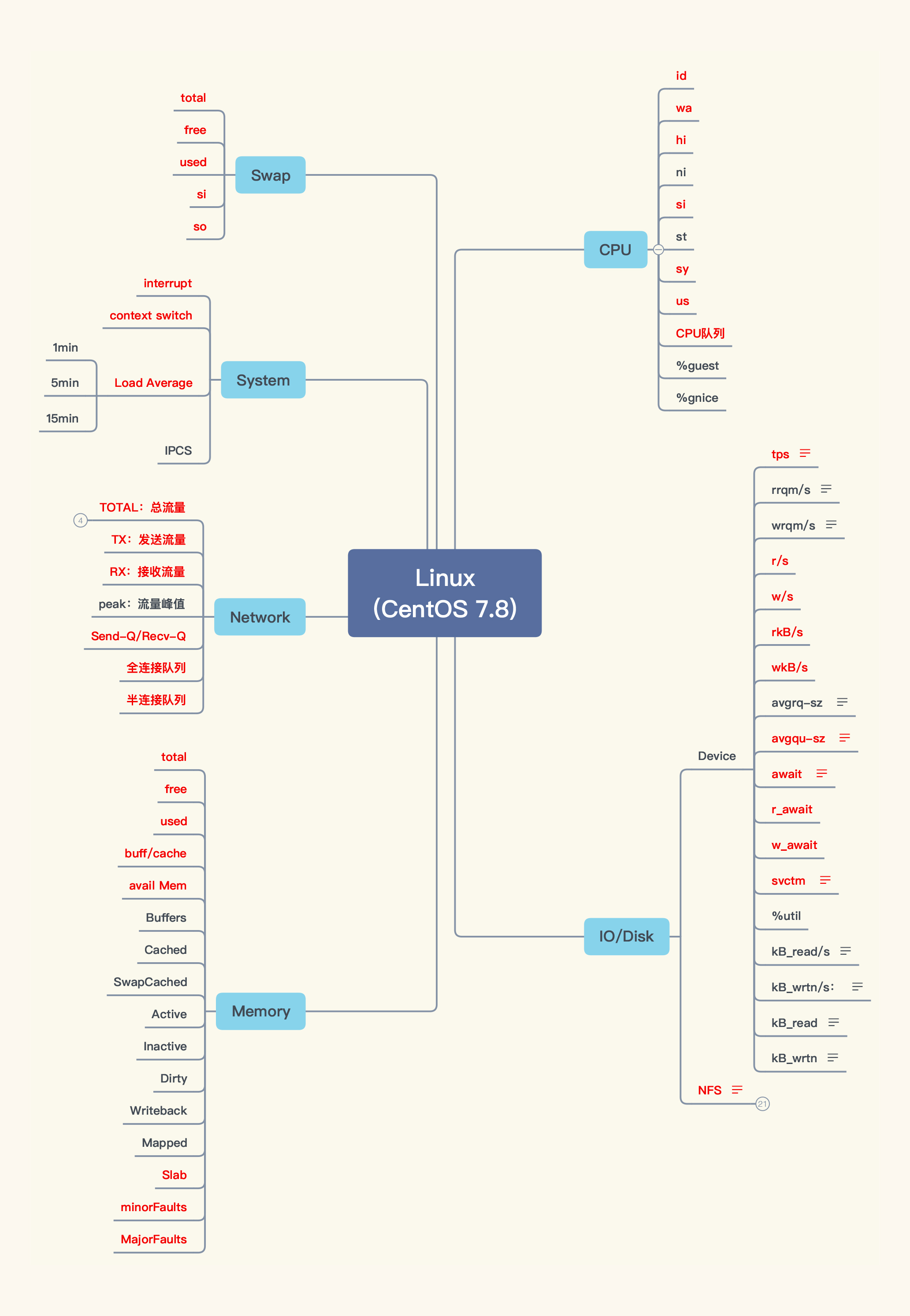 请你注意,这些计数器里,有一些会比较关键,我根据自己的经验,把重要的计数器都标红了。当然,如果你对操作系统有足够的理解,也可以从不同的角度,用不同的思路,列出自己的图。要知道,罗列计数器只是一个体力活,只要你愿意,就能列出来。